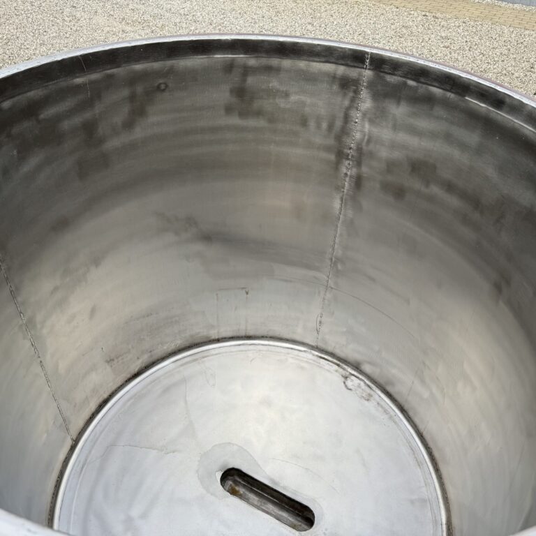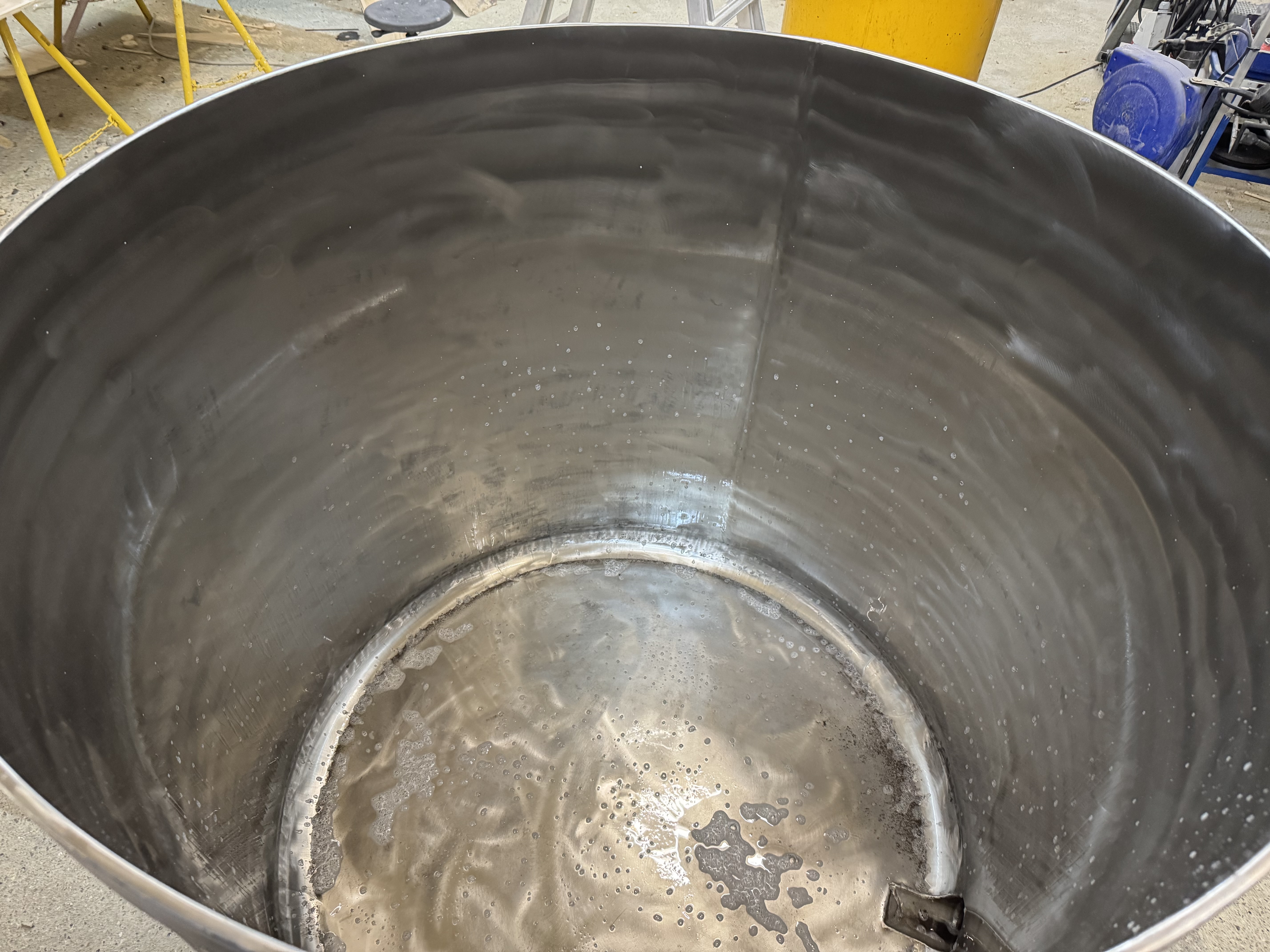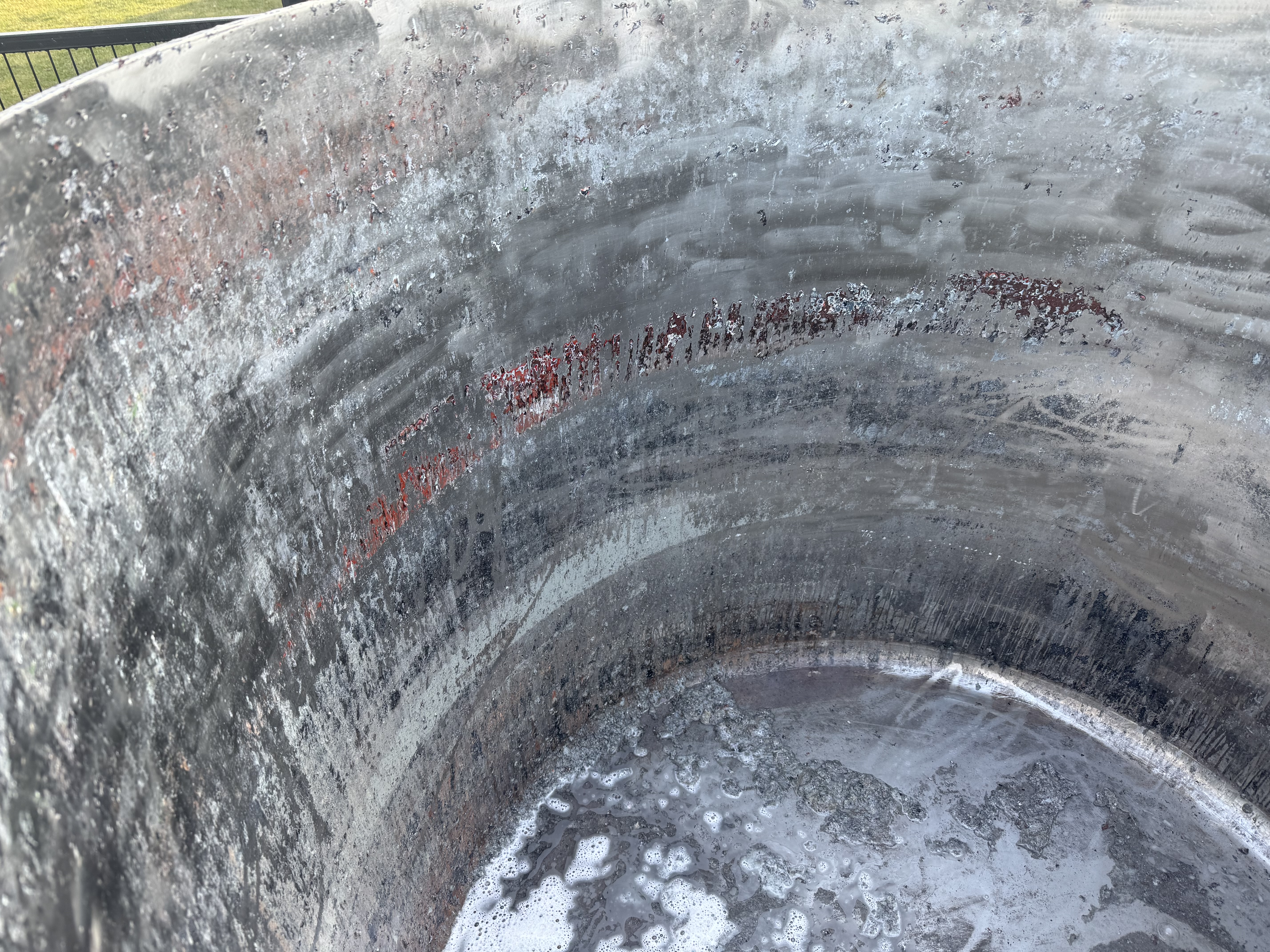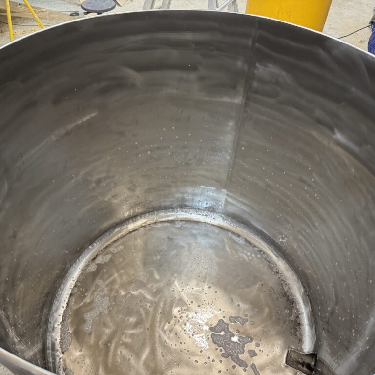 I sidste uge gik vi i gang med de første tre rustfri kar ud af i alt syv, der skal have en grundig afrensning. Denne gang har vi lagt laseren på hylden og valgt en anden metode – vores miljøvenlige rengøringsblanding, kombineret med god, gammeldags knofedt.