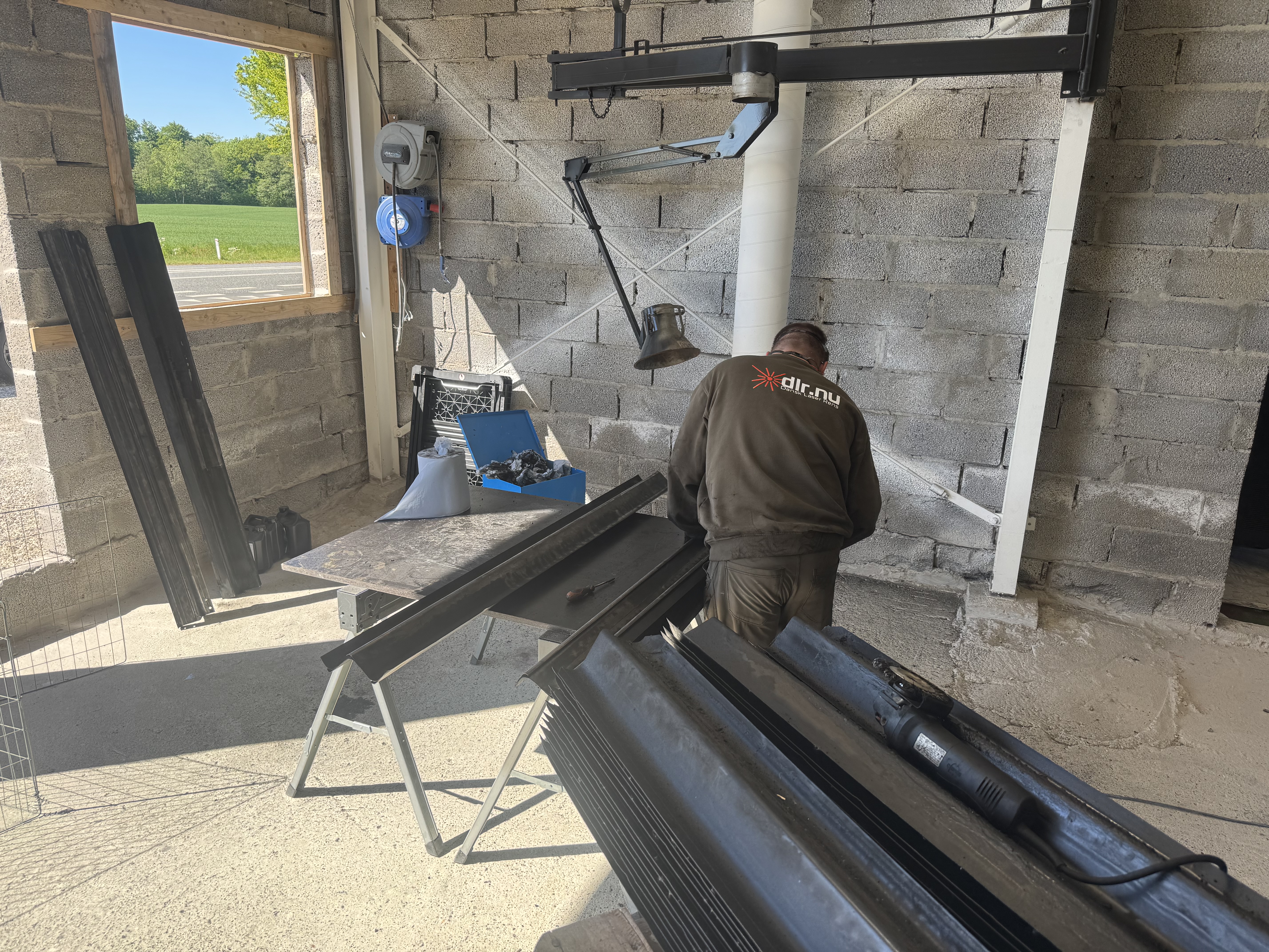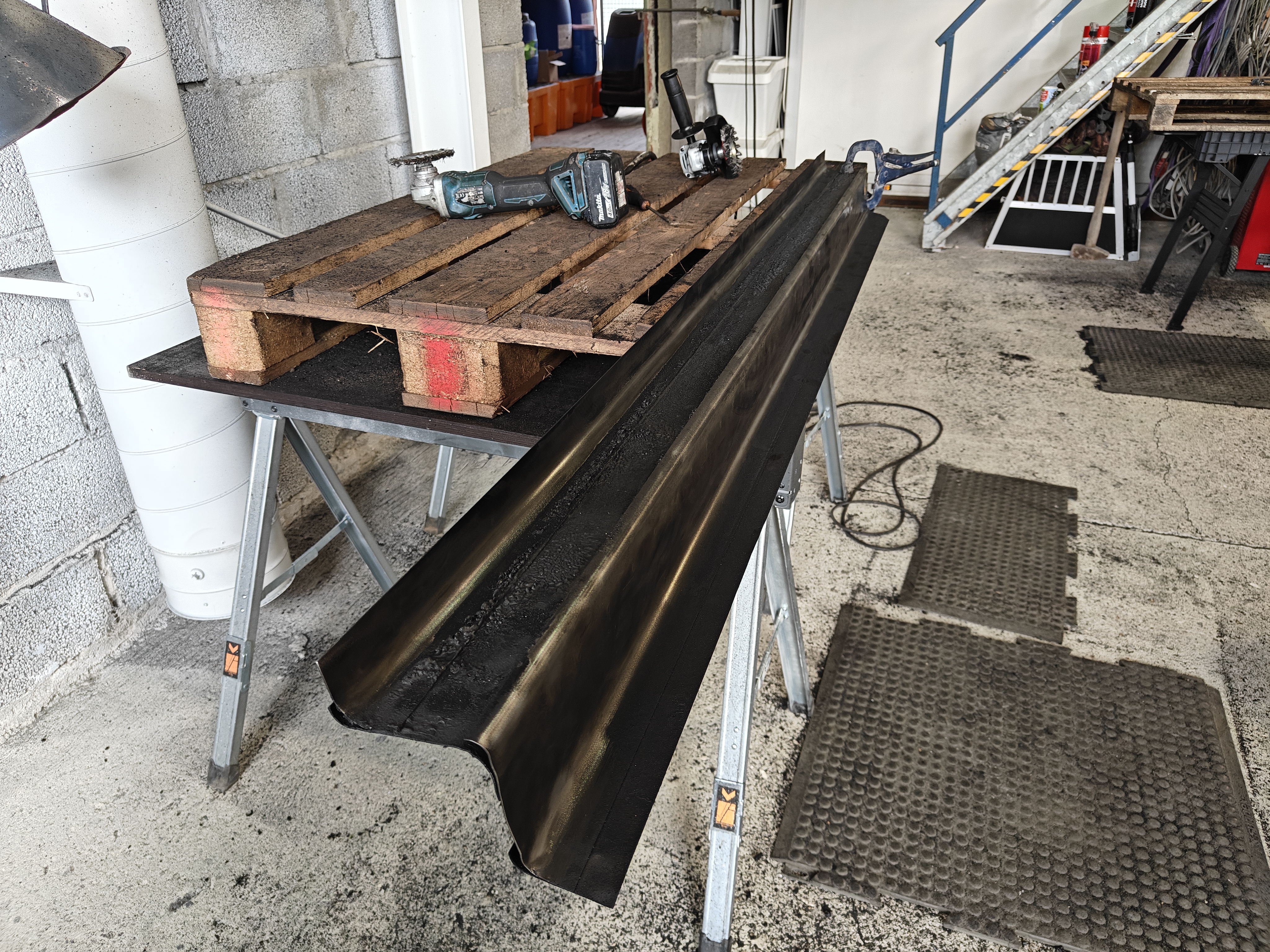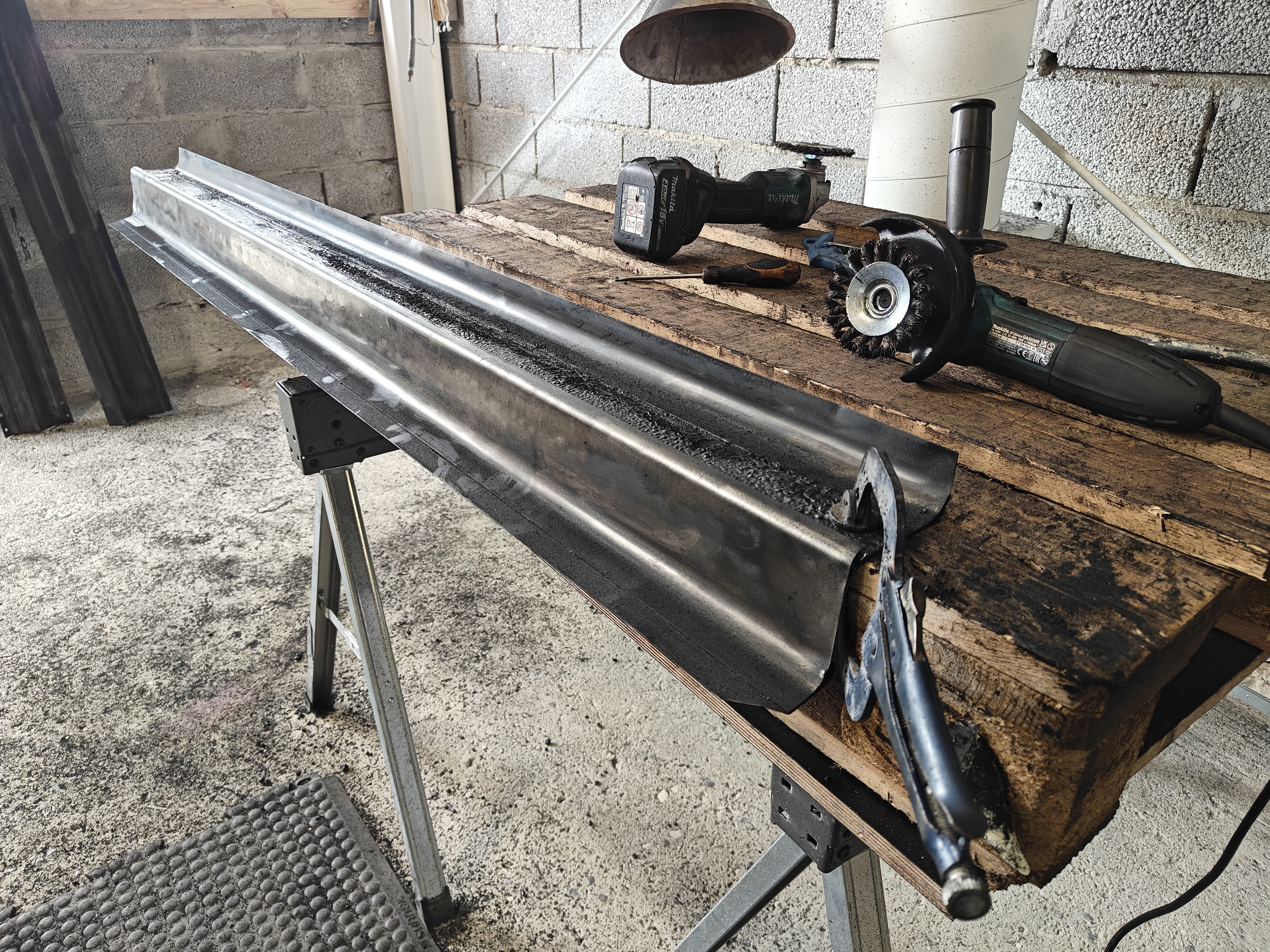 Herefter tager vi vinkelsliberen frem – monteret med en roterende stålbørste – for at fjerne de mest genstridige rester og begynde at udjævne overfladen.