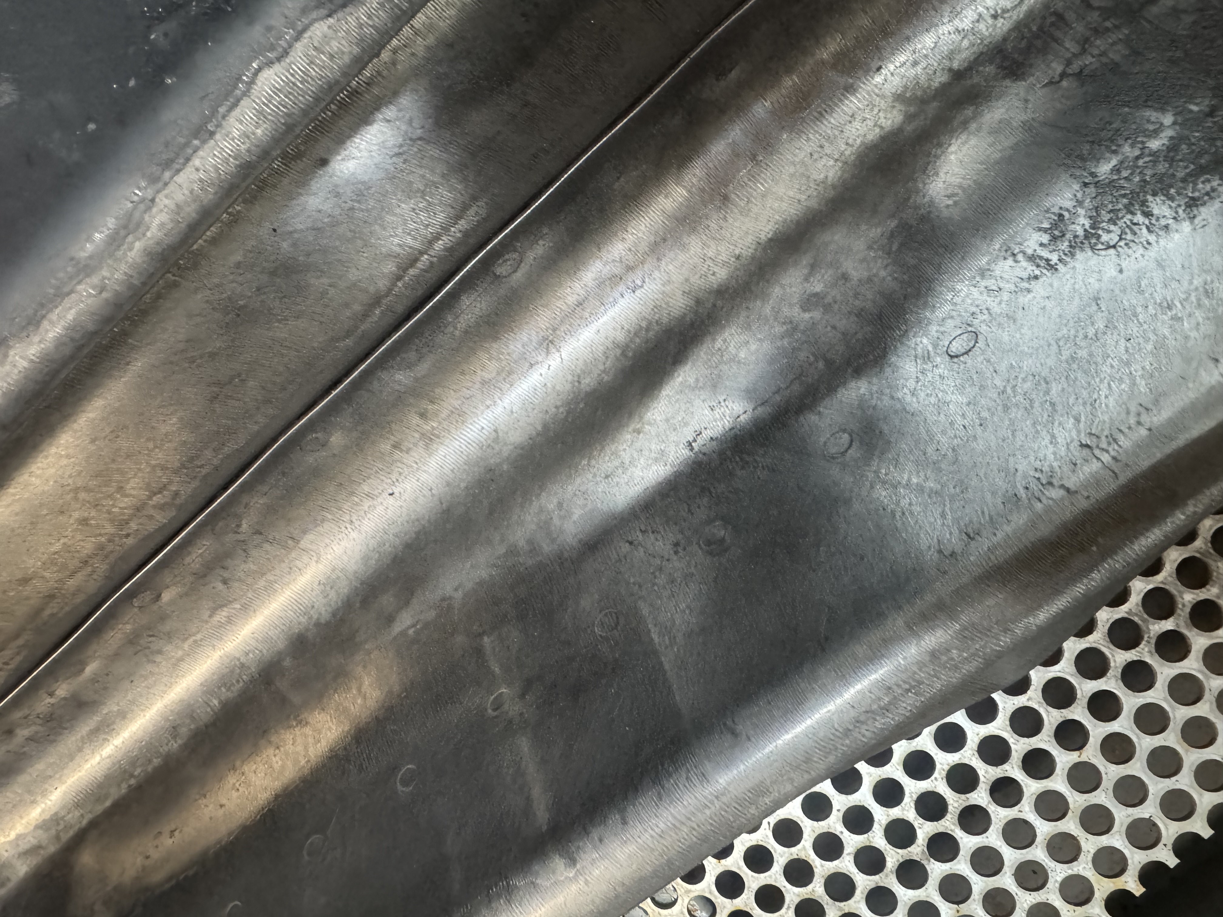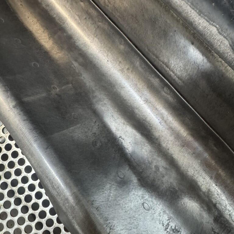Ved den afsluttende laserrensning bruger vi en fiberbaseret pulslaser, der arbejder i området omkring 100 ns pulsvarighed og med energier tilpasset det rustfri stål. Det betyder, at vi kan fordampe de sidste rester uden at ændre på metalstrukturen – ingen opvarmning, ingen deformation, kun præcis og kontrolleret afrensning. Det giver ikke bare en flot finish, men også en funktionel overflade med bedre modstandsdygtighed mod nye aflejringer.