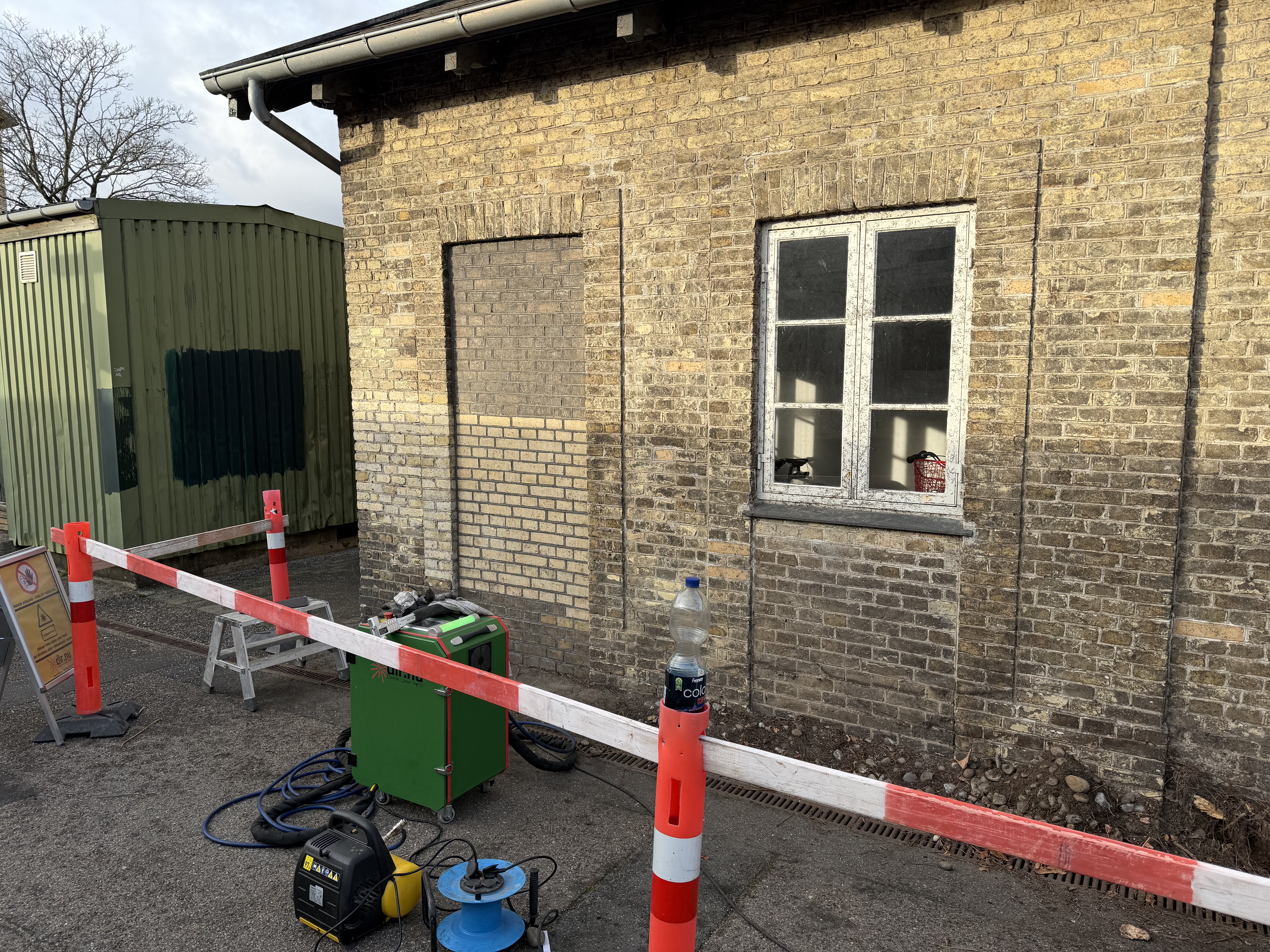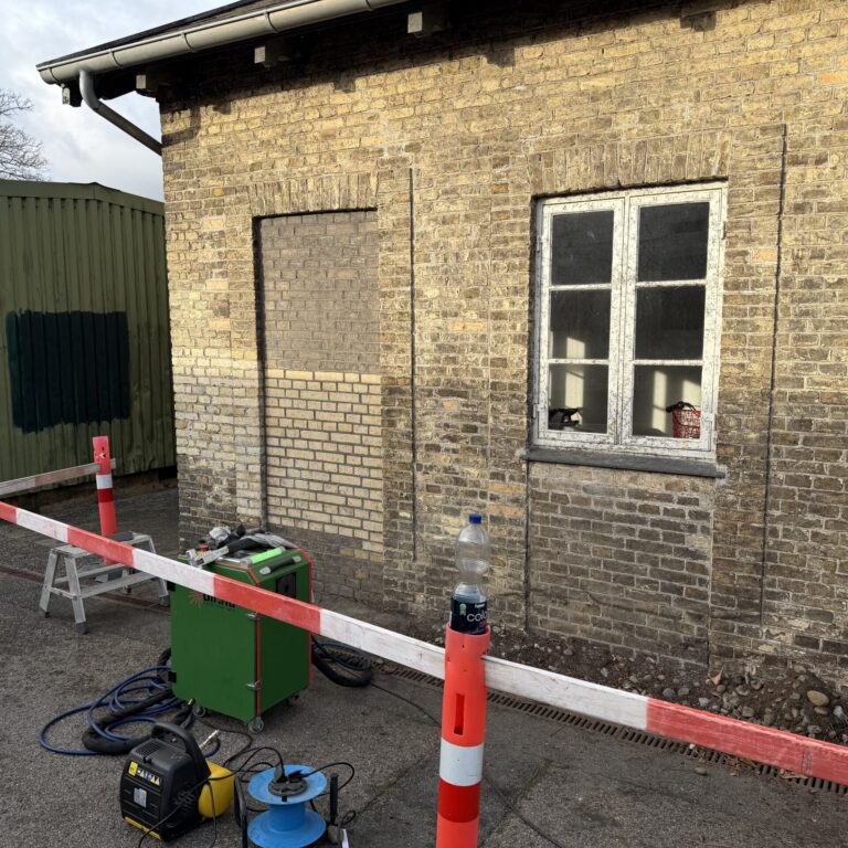 Ved vores besøg i juli gennemgik vi hele stationsanlægget og fik et klart billede af murværkets opbygning, dets skader og den kraftige tilsmudsning enkelte steder. På baggrund af gennemgangen blev det aftalt at gennemføre en prøveafrensning i september, så kunden kunne se præcis, hvilket resultat vores laserteknologi kunne levere.