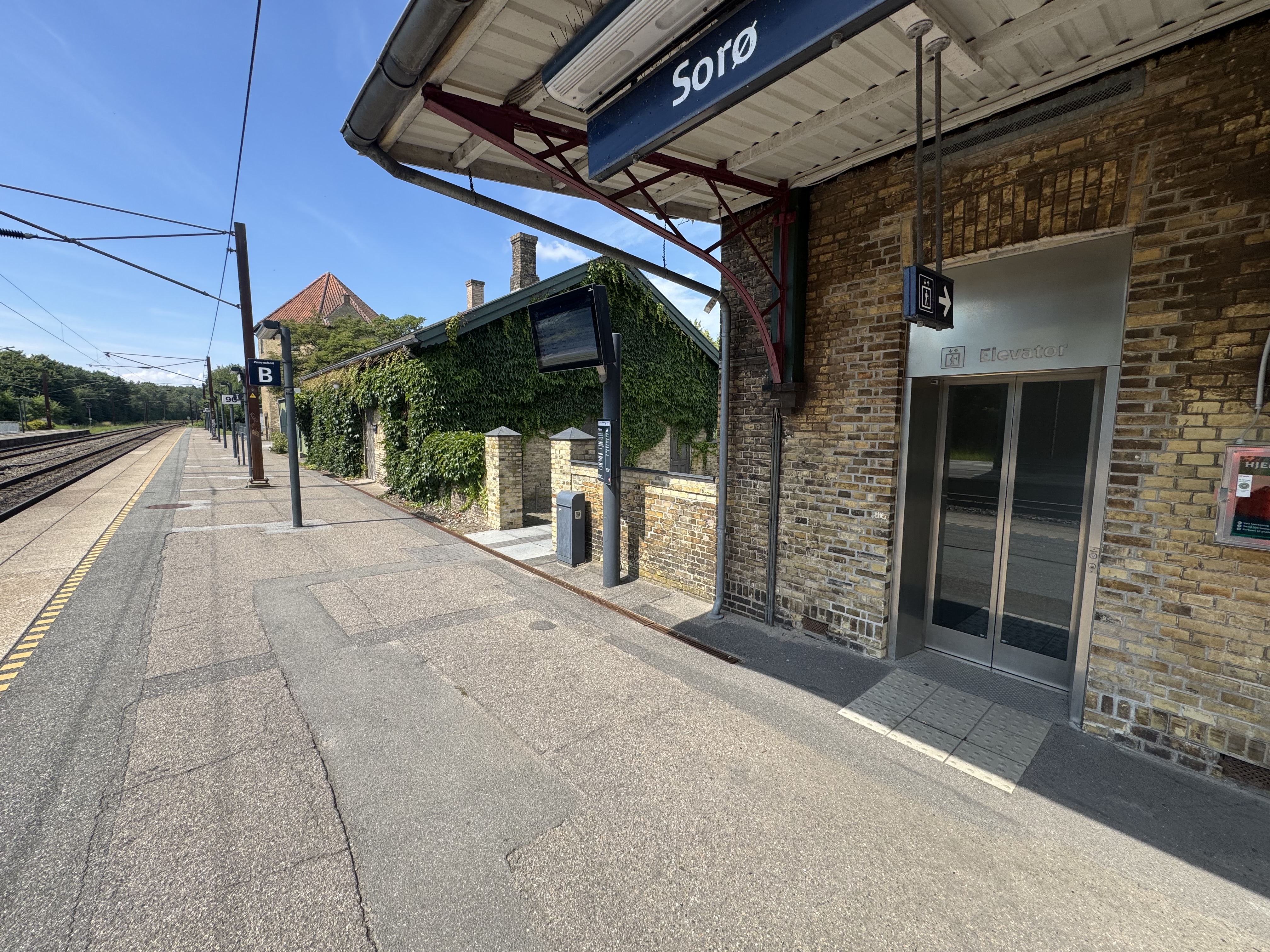 Sorø Station er en del af den gamle Vestbanestrækning og blev oprindeligt opført i slutningen af 1800-tallet. Bygningen bærer tydelige arkitektoniske træk fra perioden: gule mursten, markante gesimser og en klassisk stationsprofil, som man ser på flere af DSB’s ældre stationer.