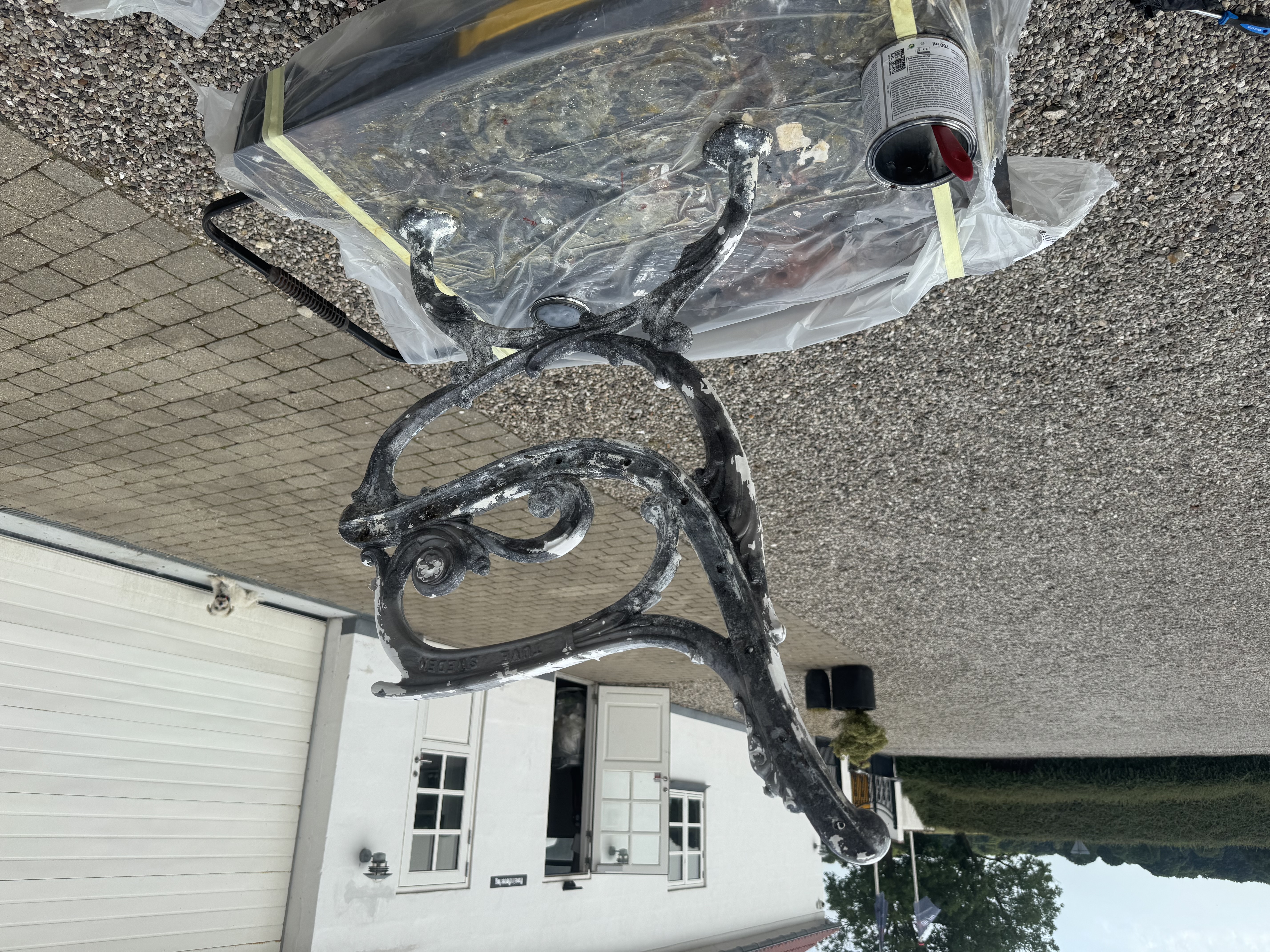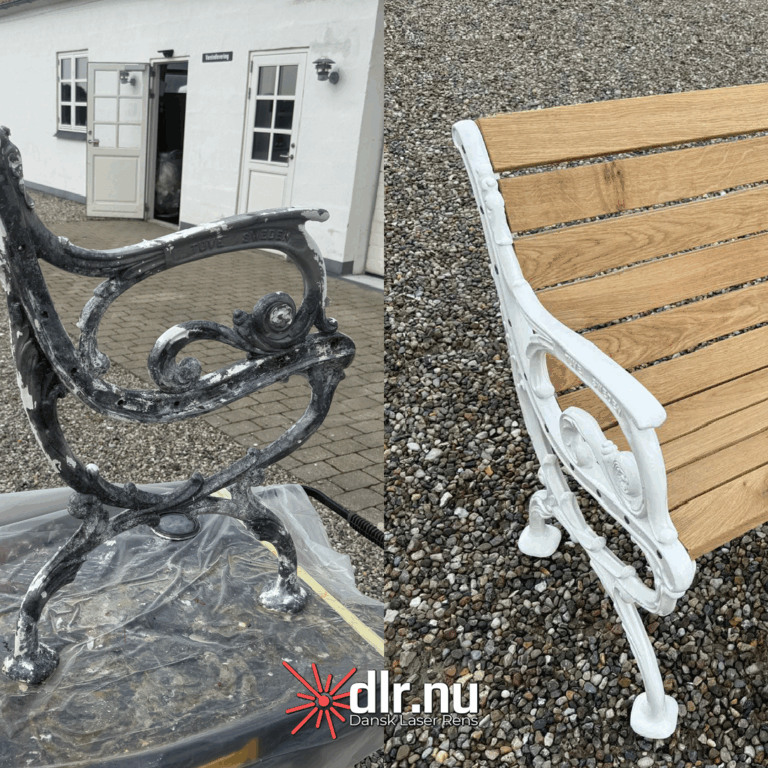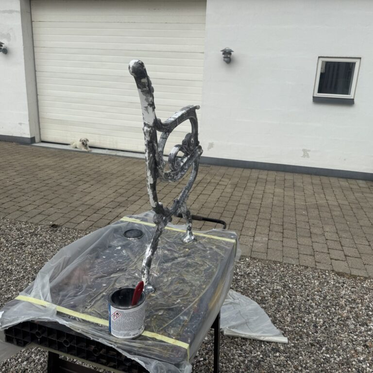 Første skridt var at fjerne gammel maling, rust og snavs. Da bænken oprindeligt var lakeret i en lys farve, valgte vi syreafrensning frem for laser. Laser fungerer bedst på mørkere overflader, hvor energien lettere absorberes – men på lyse farver kan den have svært ved at få fat.