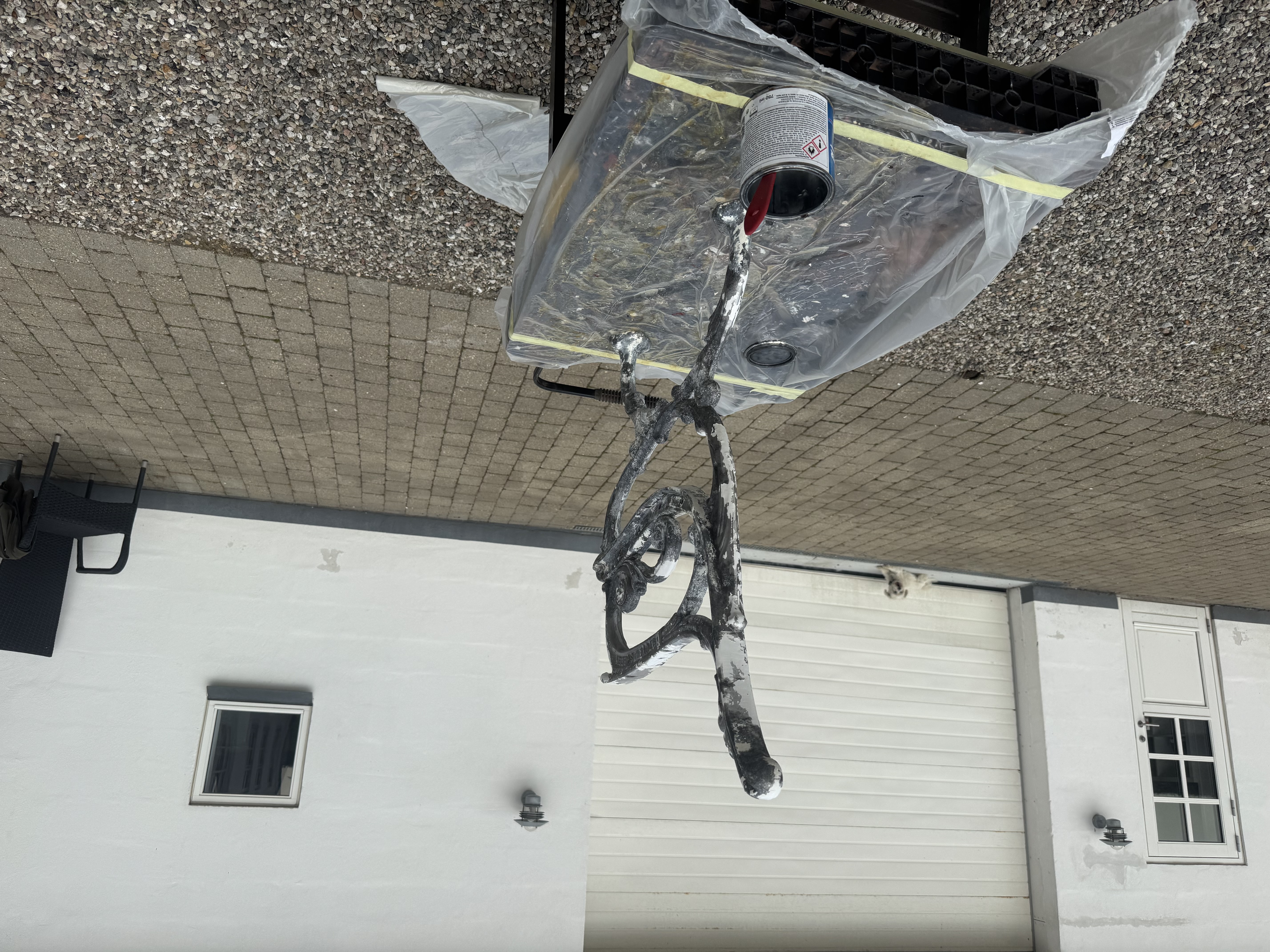 Når metallet var helt rent og tørt, blev det pulverlakeret i en frisk hvid farve. Pulverlakeringsprocessen sikrer en ekstremt holdbar og jævn overflade. Pulveret påføres elektrostatisk og hærdes derefter i ovn ved høj temperatur, hvor det smelter sammen til en hård, beskyttende lak.