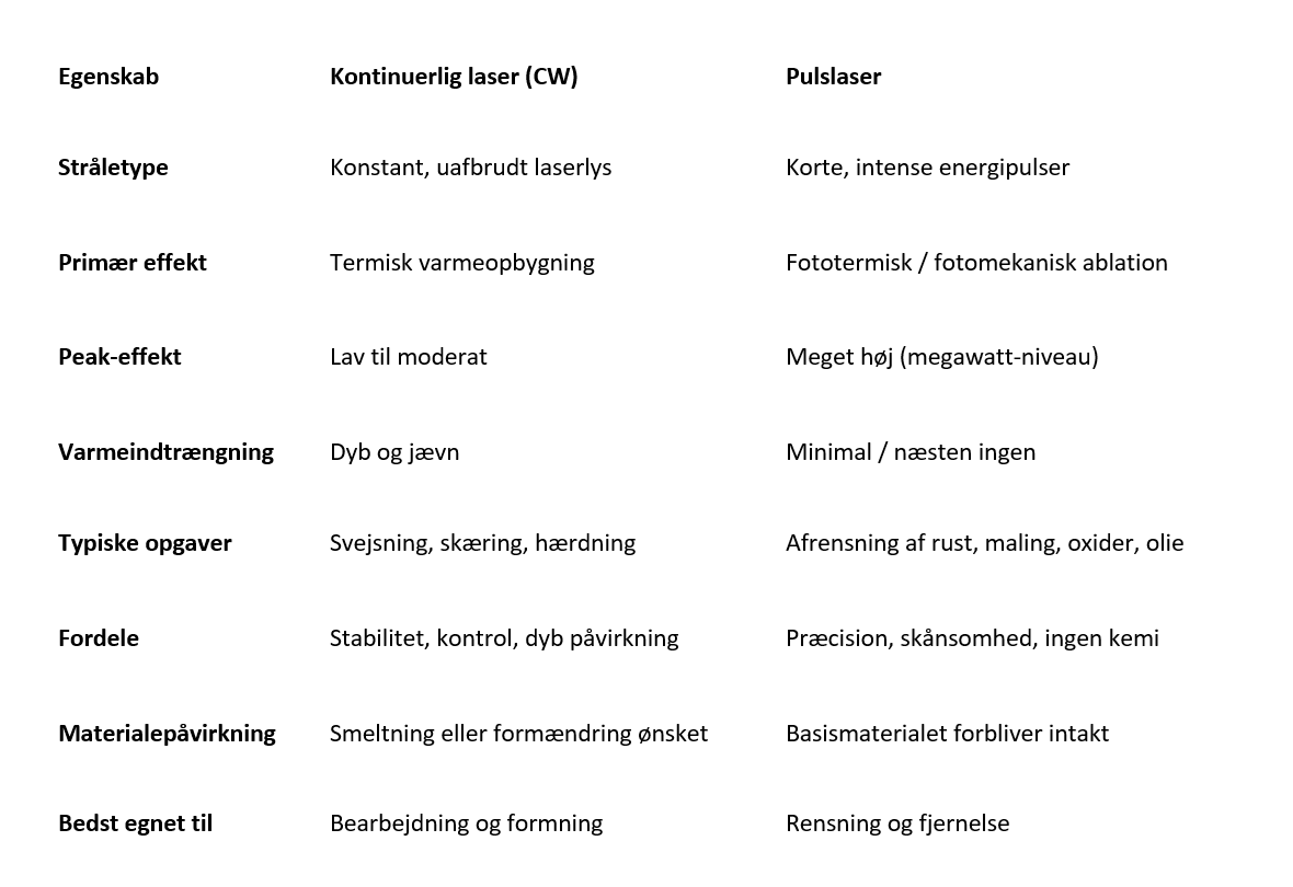 Skemaet giver et hurtigt og letforståeligt overblik over de vigtigste forskelle mellem kontinuerlig laser (CW) og pulslaser. Selvom begge teknologier arbejder med laserlys, fungerer de efter helt forskellige principper og bruges derfor til helt forskellige opgaver i industrien.