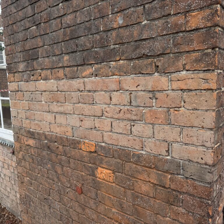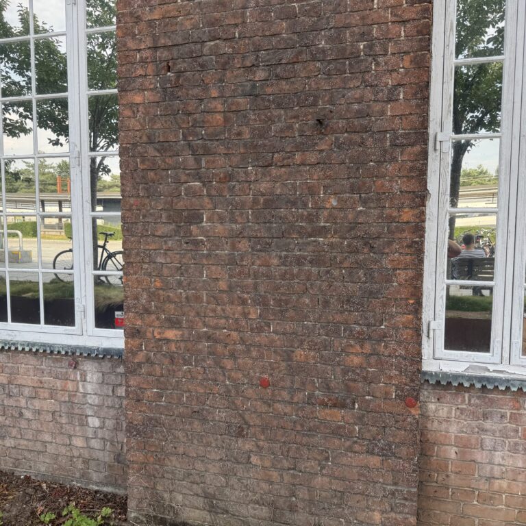 Også murværket fik nyt liv efter afrensningen. De oprindelige farver og strukturer kom til syne, og overfladen fremstod markant friskere og mere ensartet. Til denne prøve valgte kunden ikke at få murværket imprægneret efterfølgende, hvilket man tydeligt kan se på billederne – overfladen står mere rå og åben. Det understreger samtidig, hvor vigtig en afsluttende imprægnering er, hvis man ønsker at beskytte resultatet og bevare udtrykket mange år frem.
