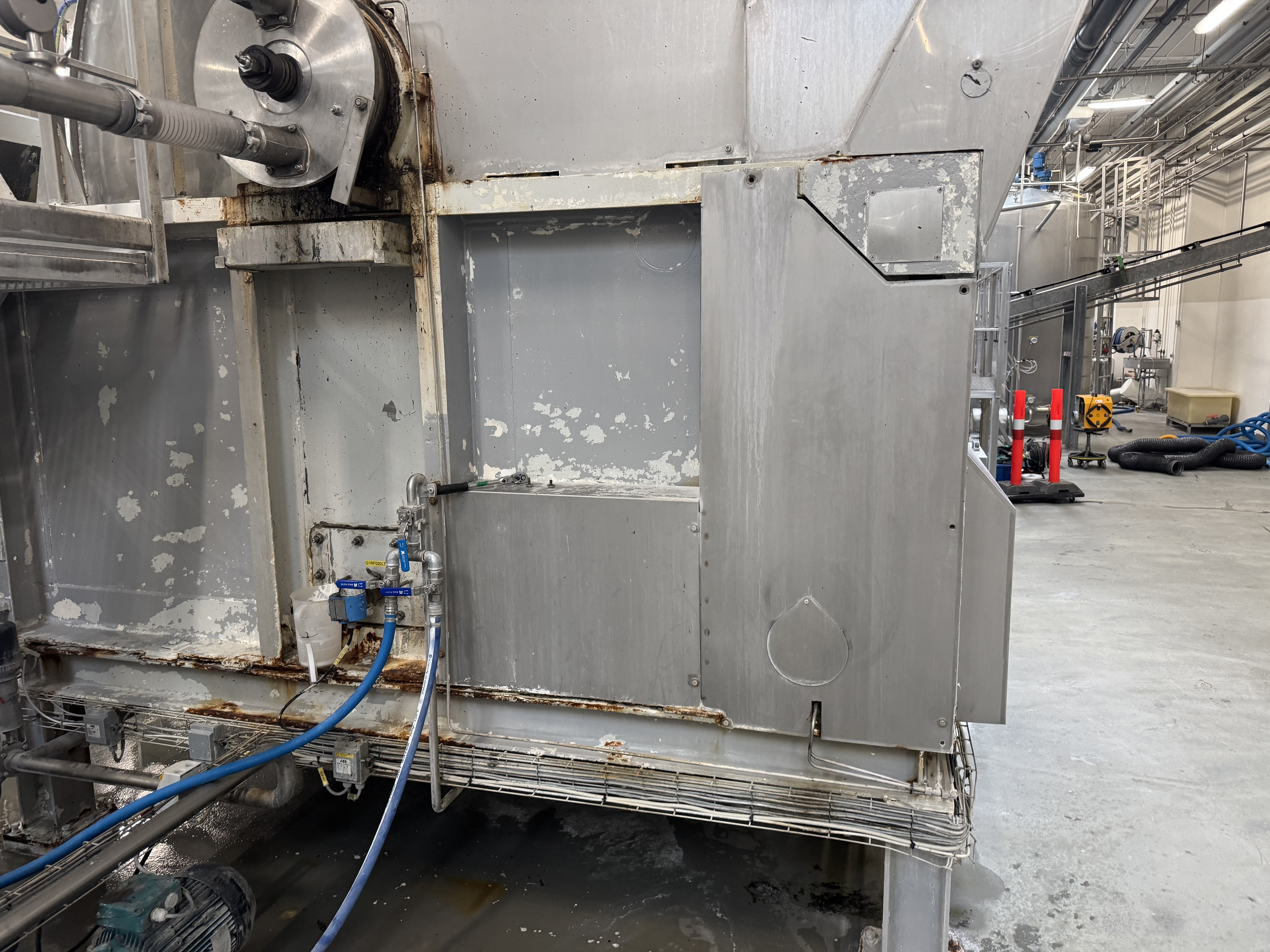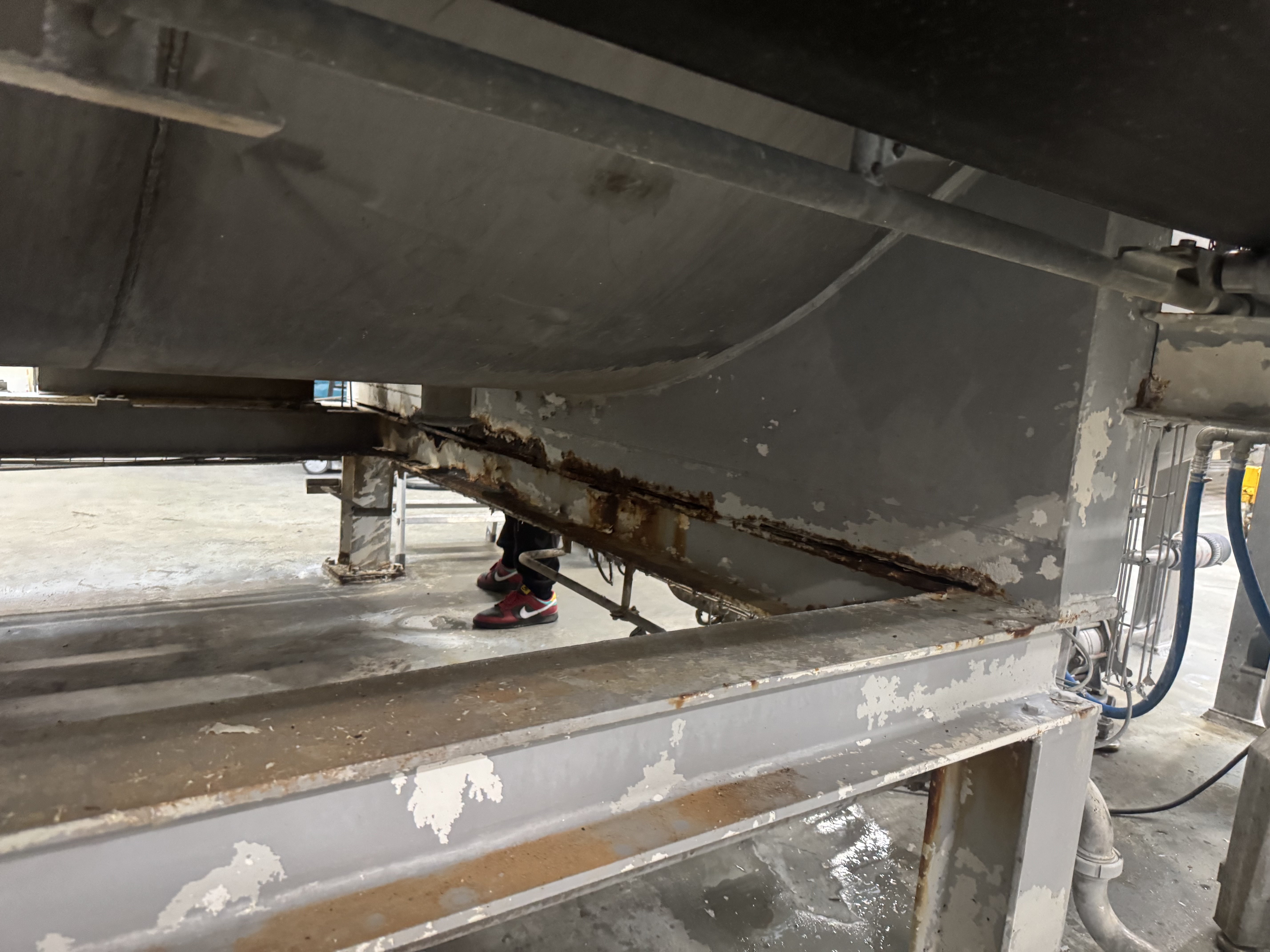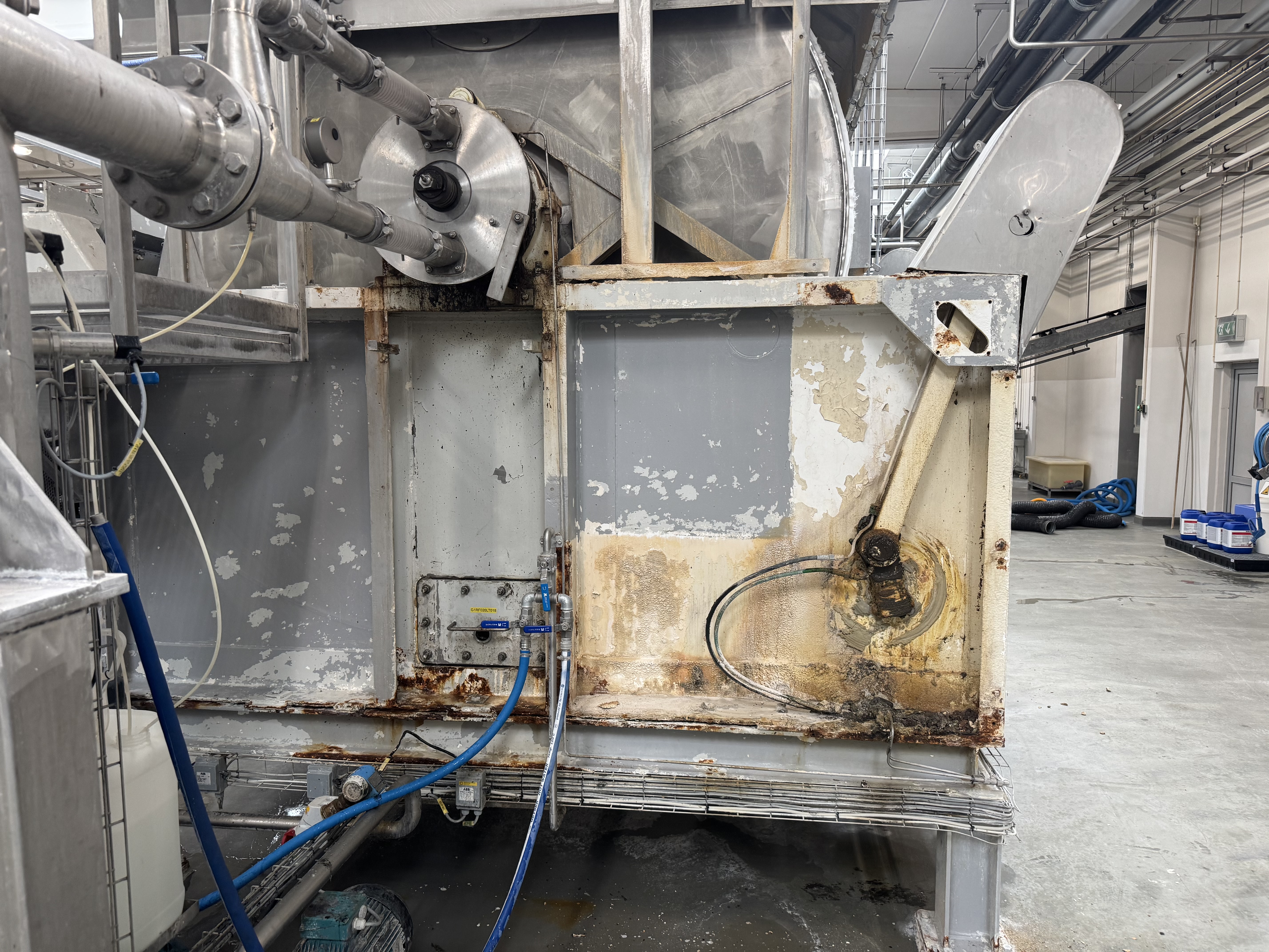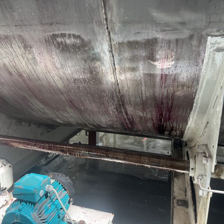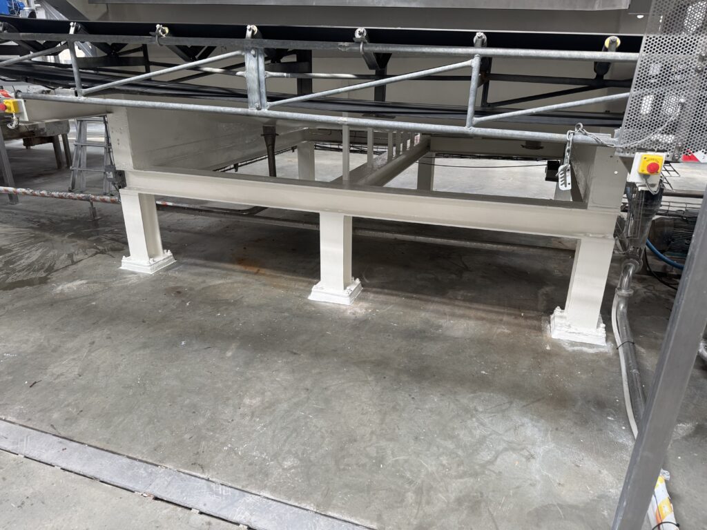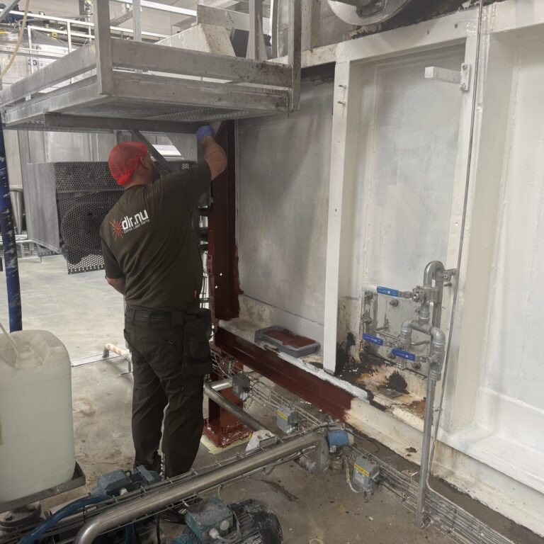 Efter hærdning har vi påført to lag fødevaregodkendt polyurethanlak. Denne lak er valgt pga. dens høje kemikalie- og slidresistens, og den opfylder kravene i EU-forordning 1935/2004 om materialer i kontakt med fødevarer. Det sikrer, at anlægget igen kan anvendes i fødevareindustrien uden risiko for kontaminering.