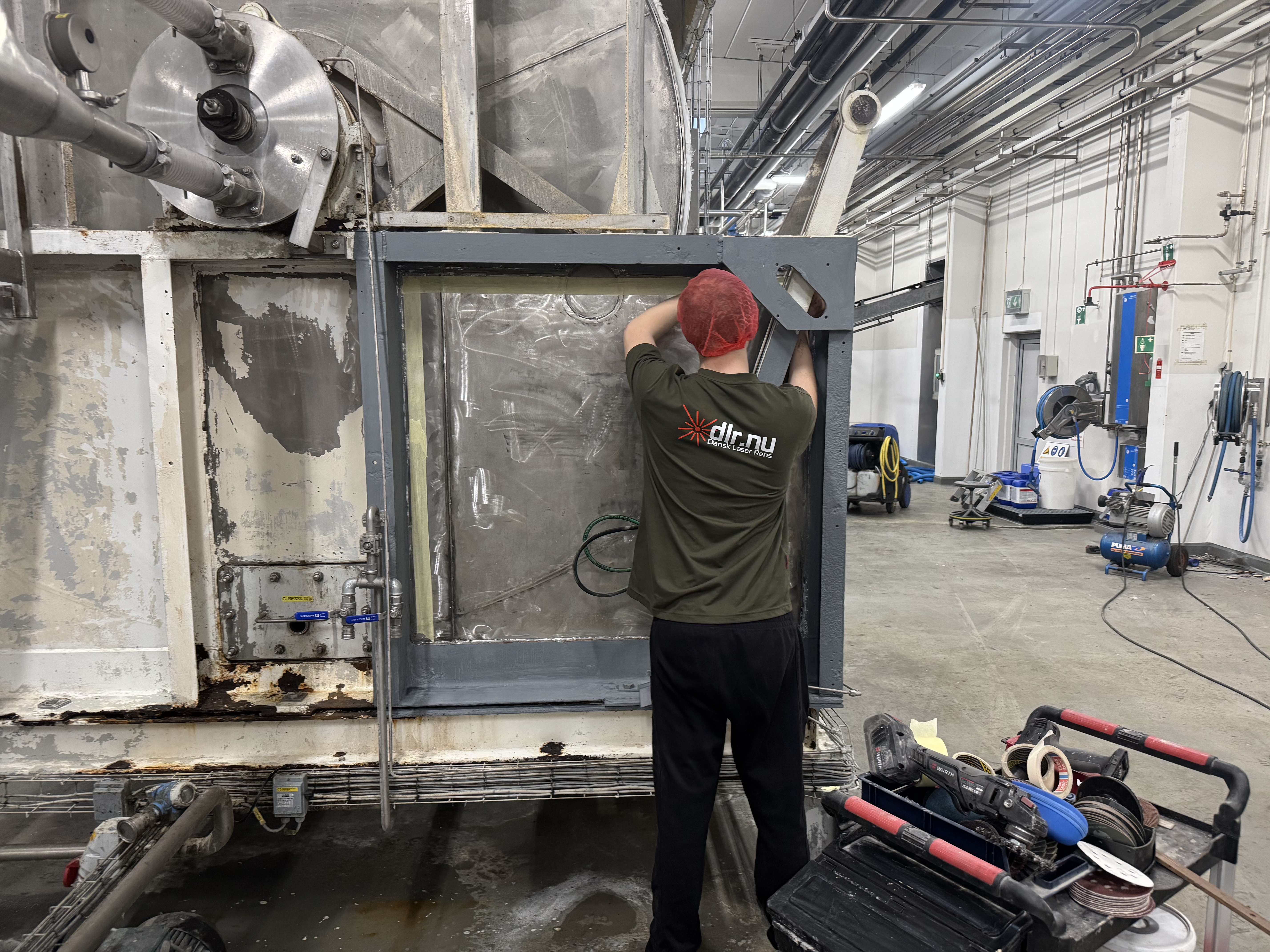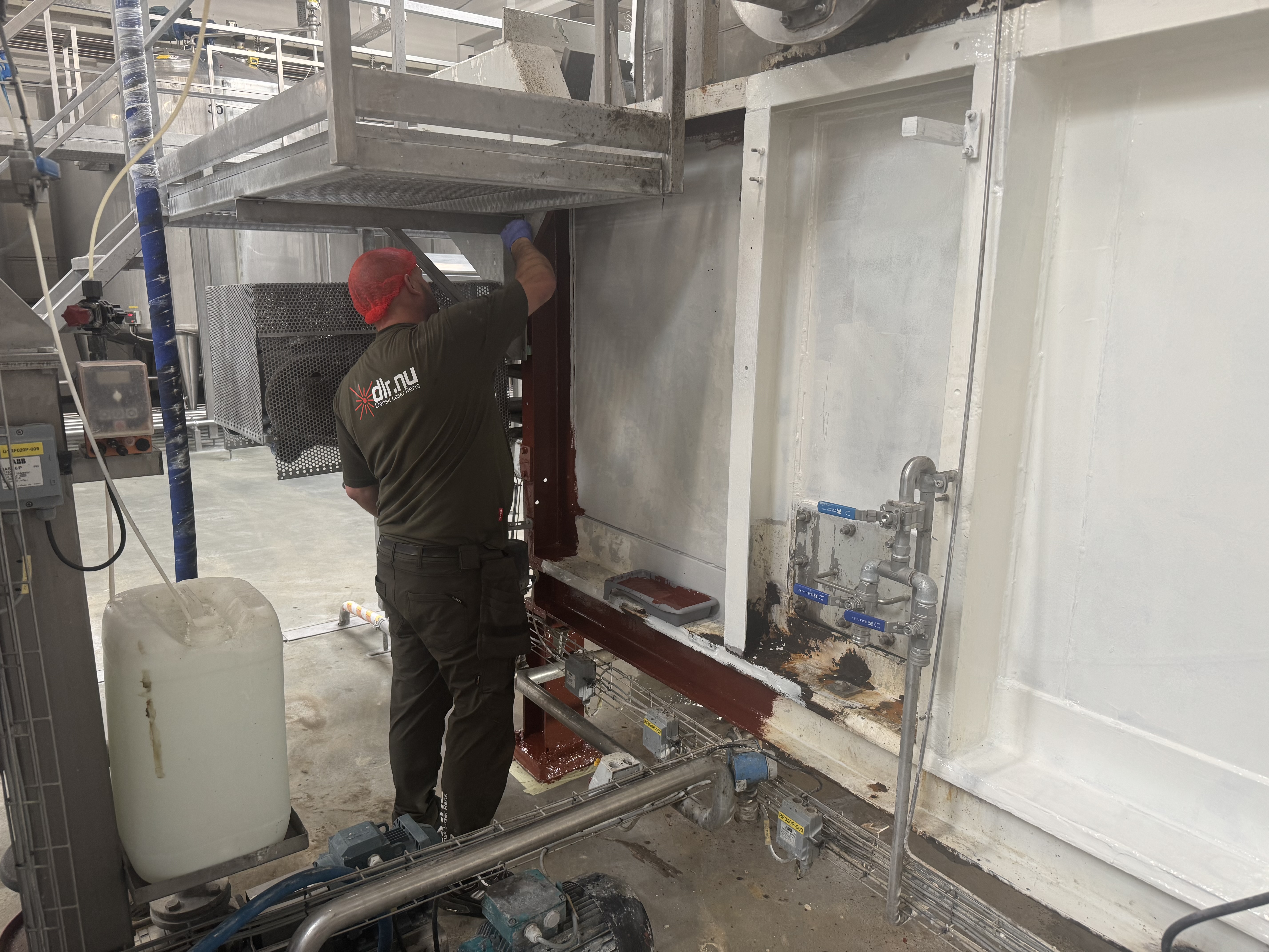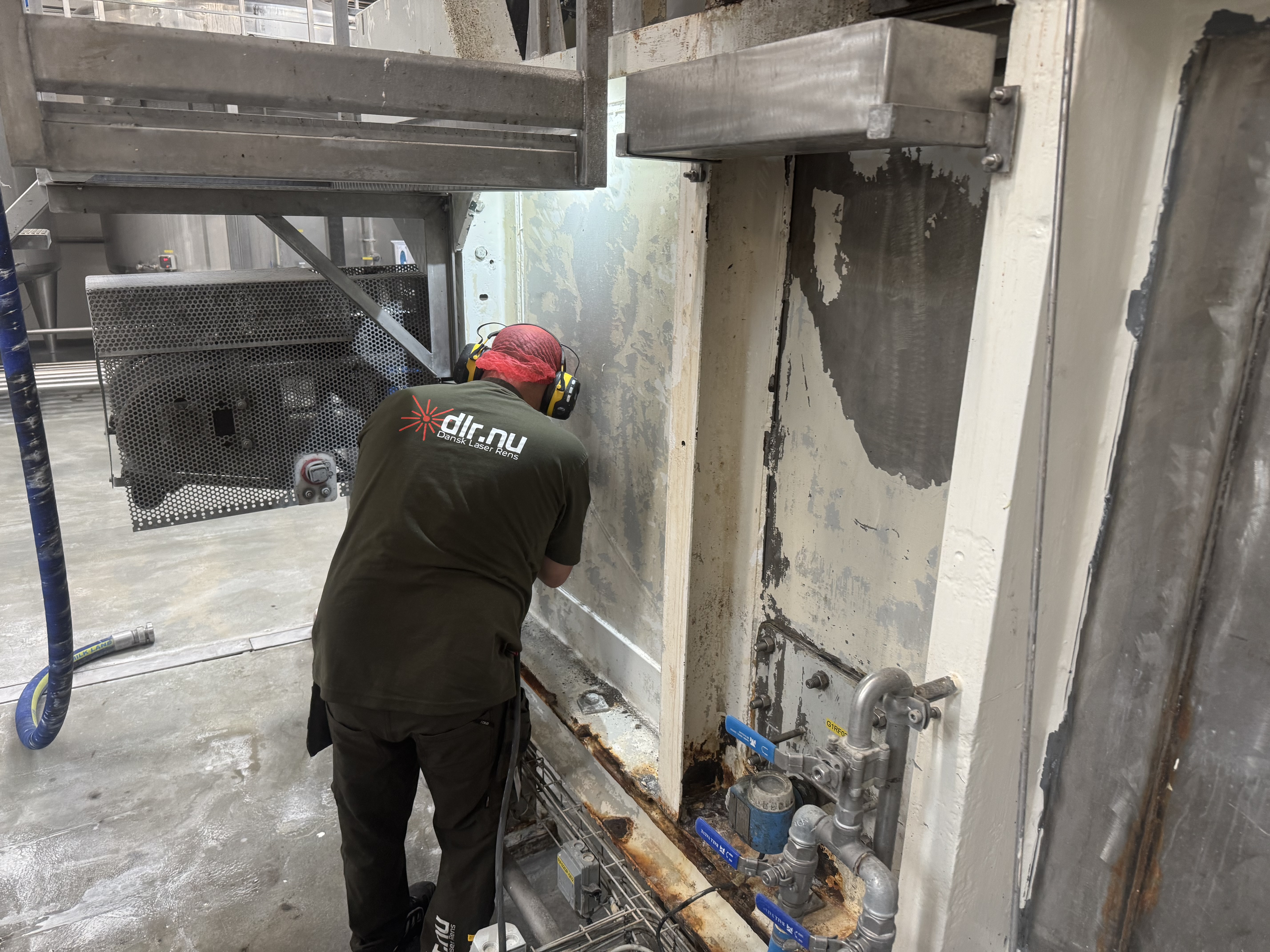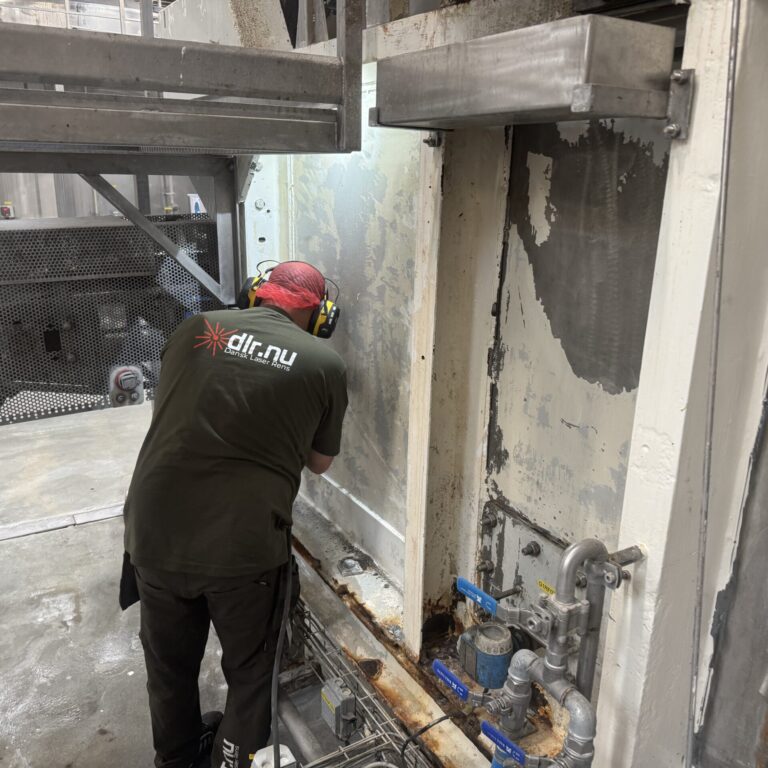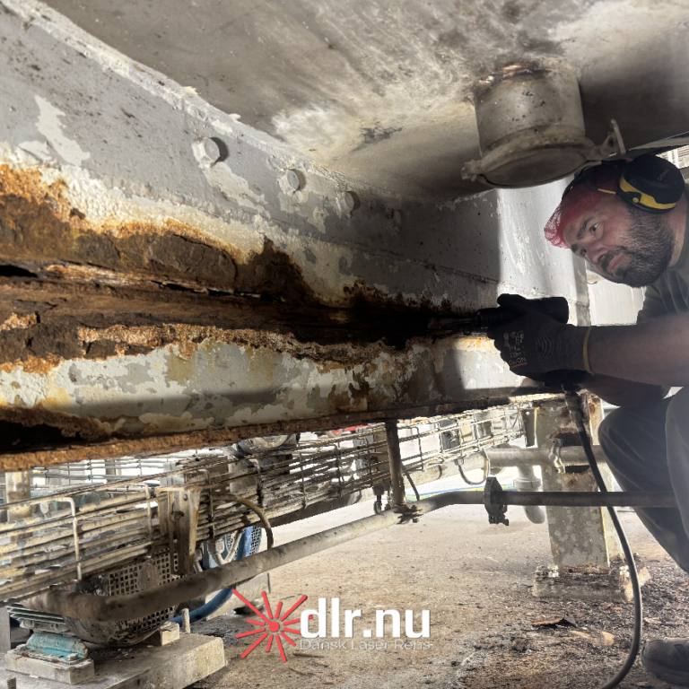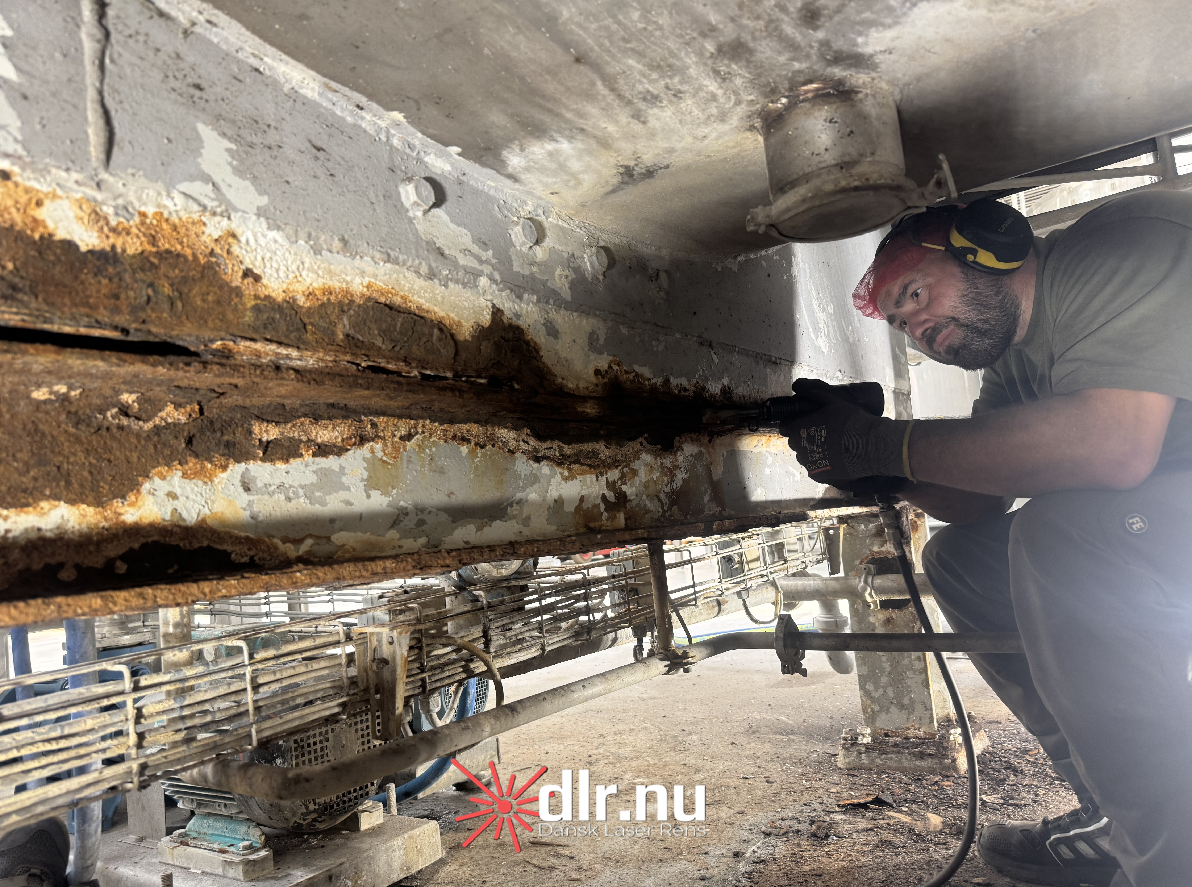 Processen startede med laserafrensning, hvor vi fjernede rust, flere lag gammel maling, olie- og fedtaflejringer samt øvrige kontaminanter. Laserafrensning er valgt frem for traditionelle metoder som sandblæsning, da teknikken er mere skånsom mod underlaget og samtidig ekstremt præcis. Den anvendte laser har en bølgelængde og pulsstruktur optimeret til at fordampe overfladeforurening uden at beskadige basismaterialet.