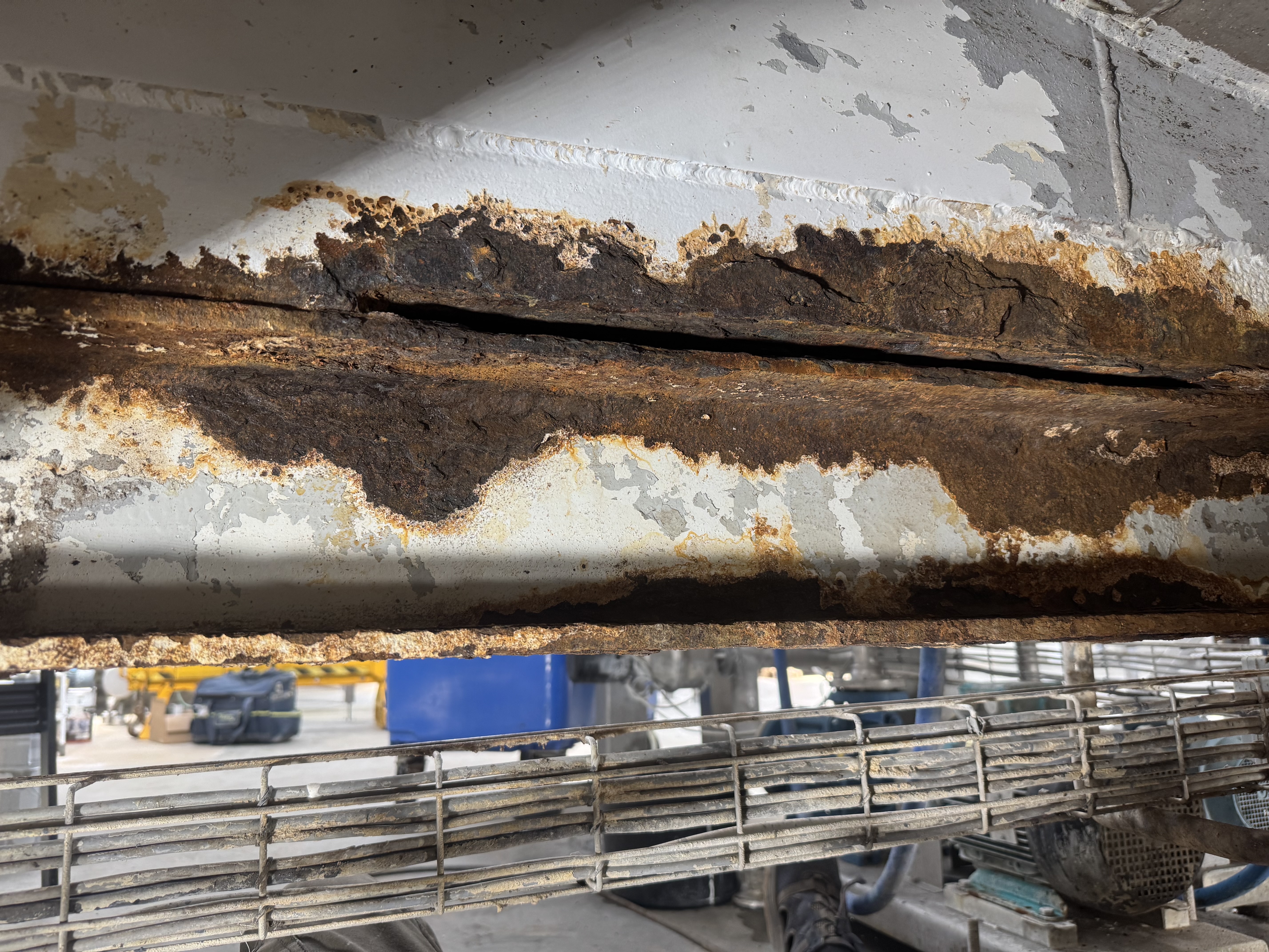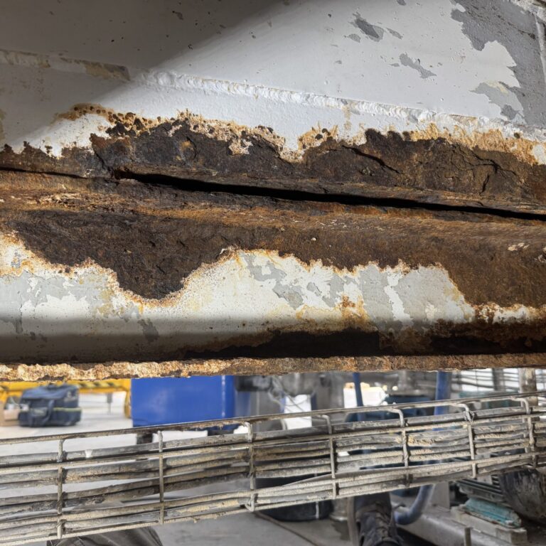Som det fremgår af billederne, står vi dog over for store udfordringer: Flere sektioner af konstruktionen er så tærede og mekanisk svækkede, at de ikke kan genbruges og må udskiftes helt. Vi dokumenterer løbende tilstanden og udskiftningerne, så både sporbarhed og kvalitet kan sikres hele vejen.