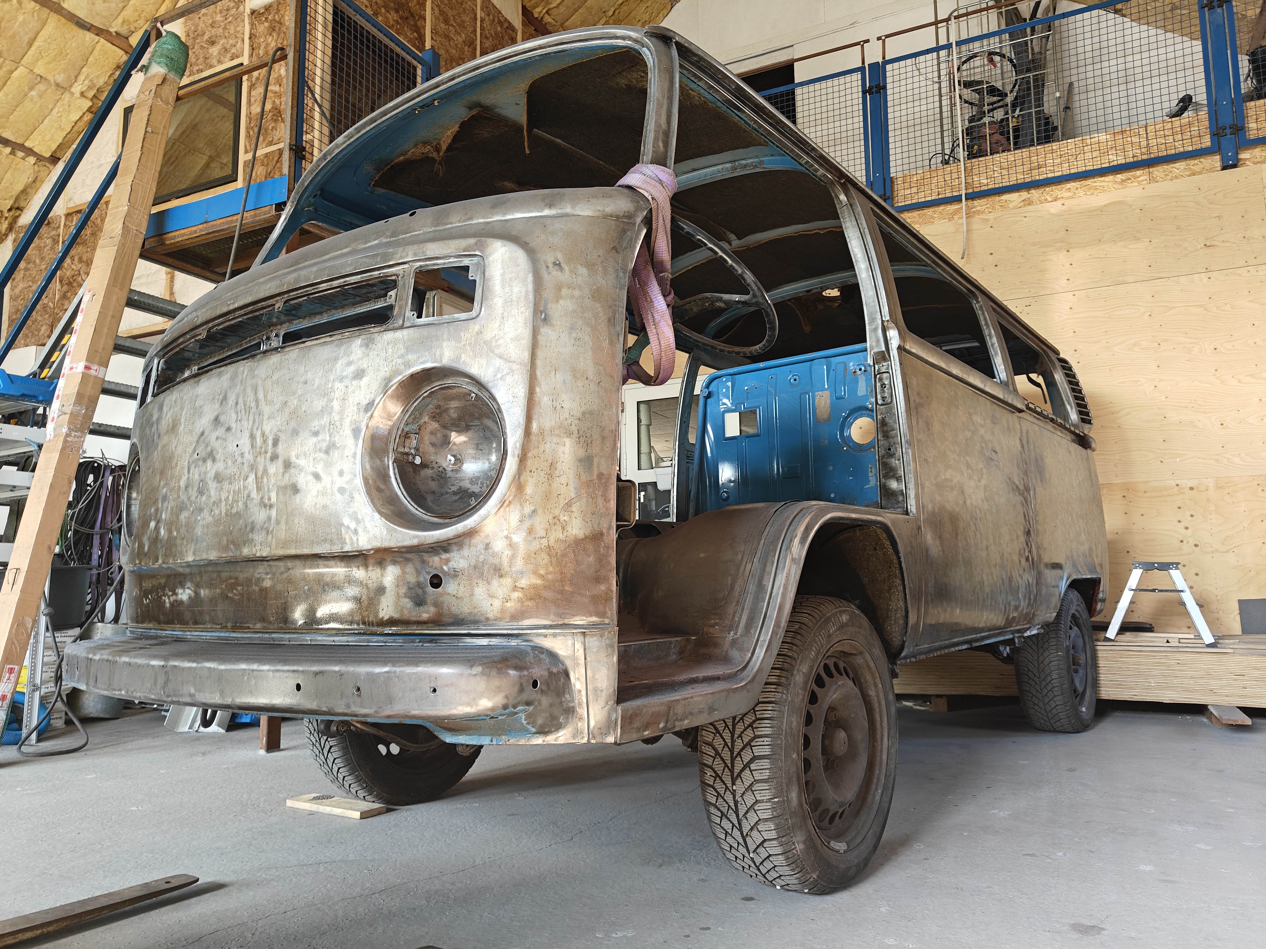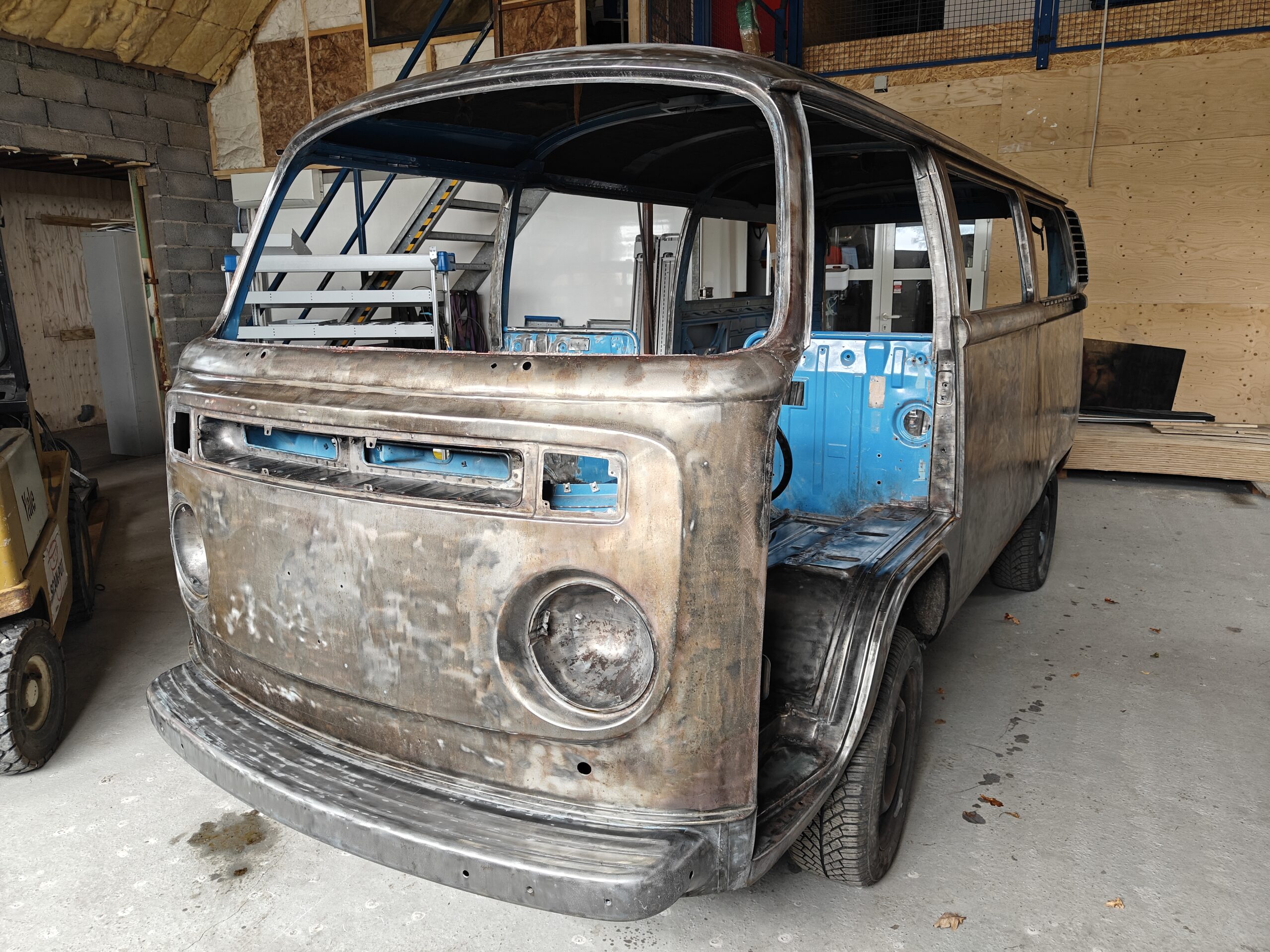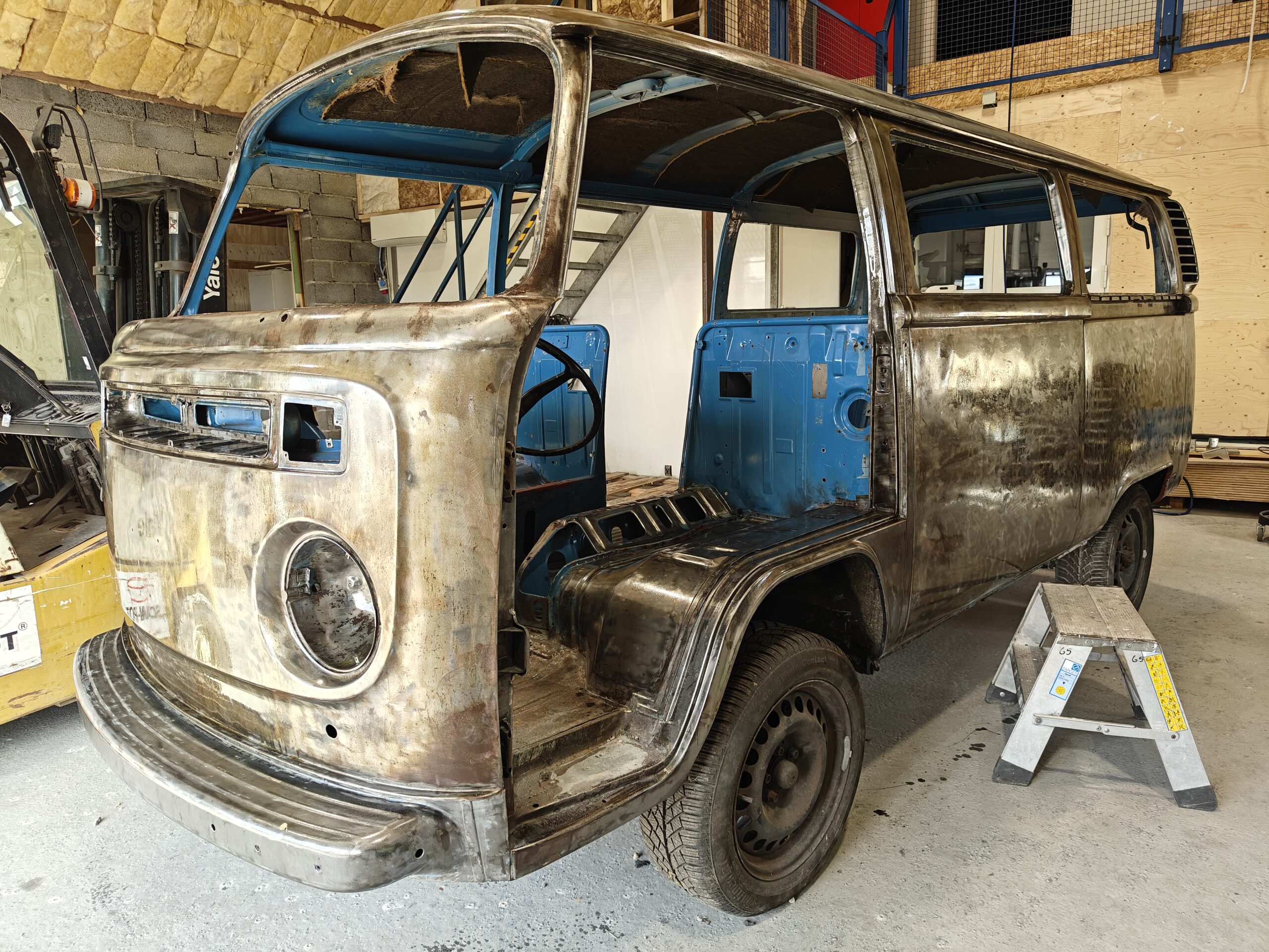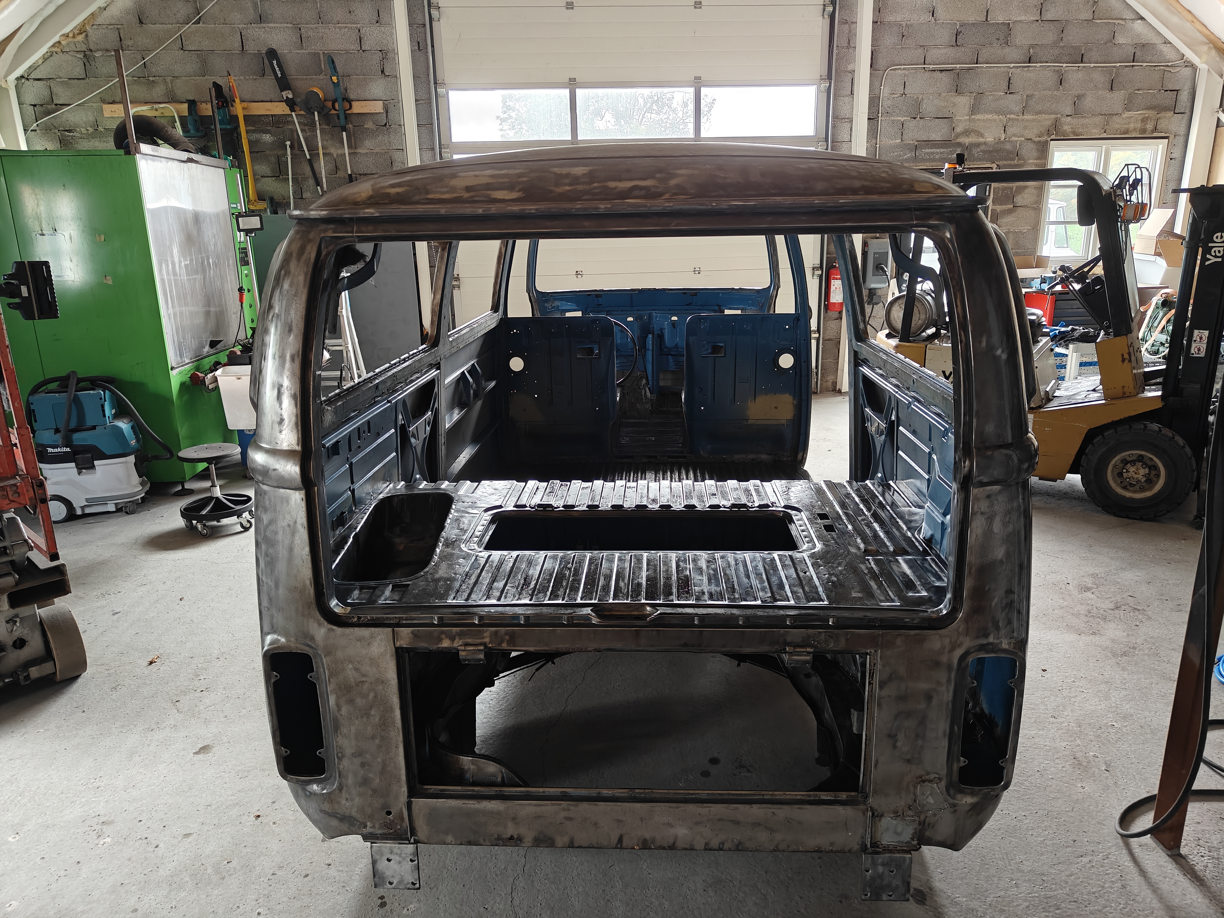 Resultatet er en VW T2, der igen står med et solidt fundament – fri for flyverust og med et motorrum, som nu er klar til renovering.