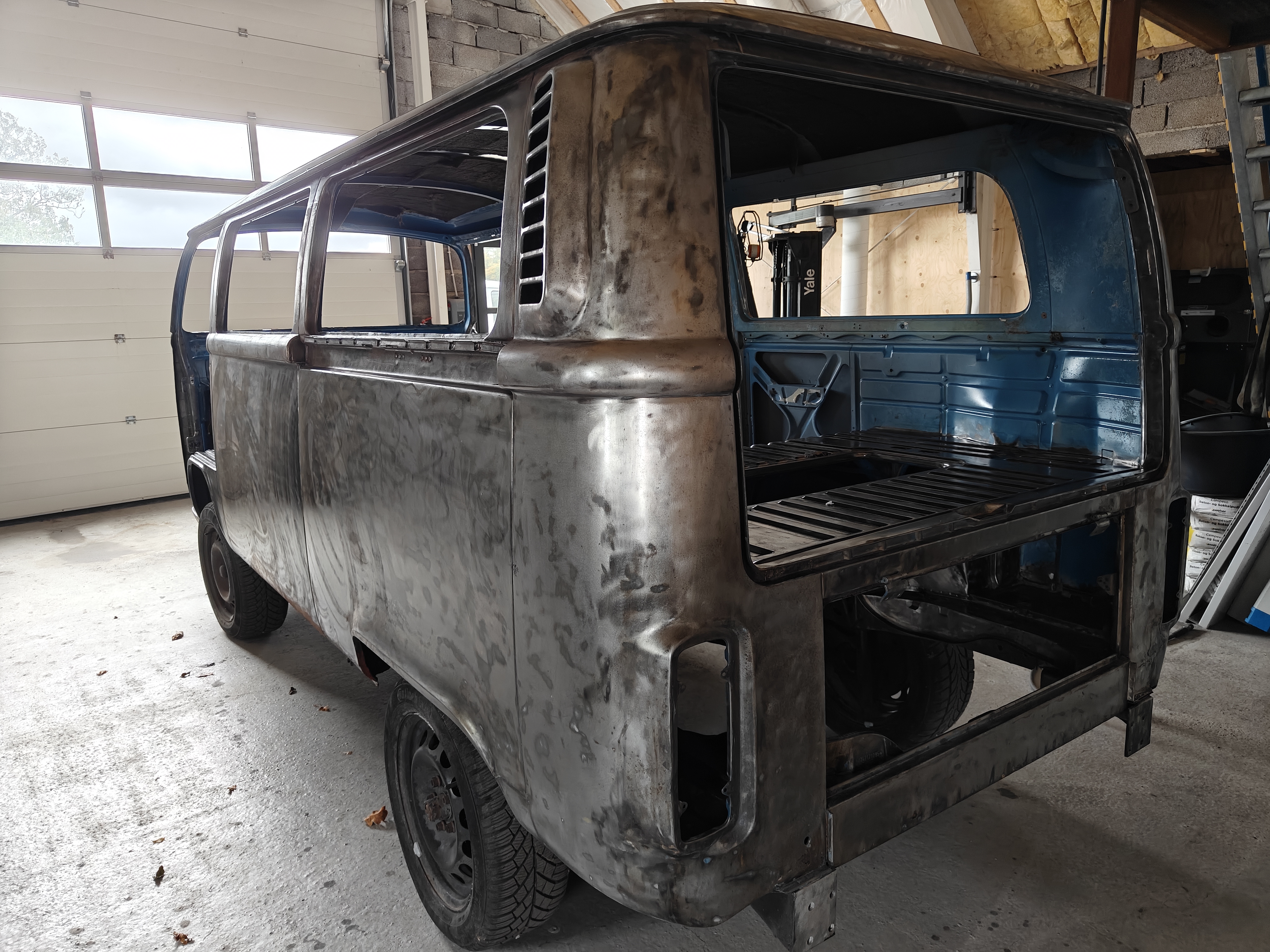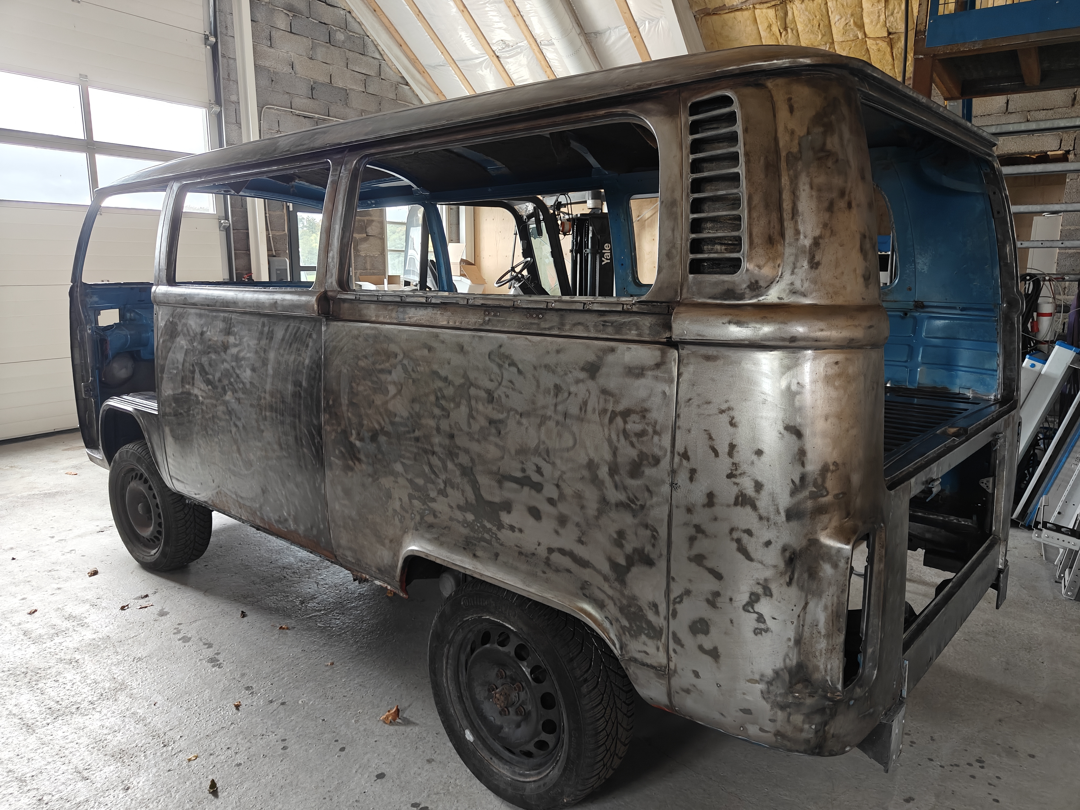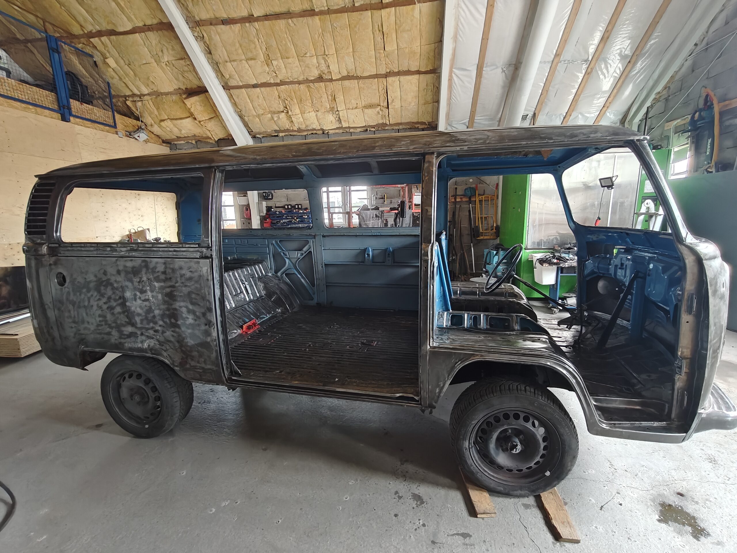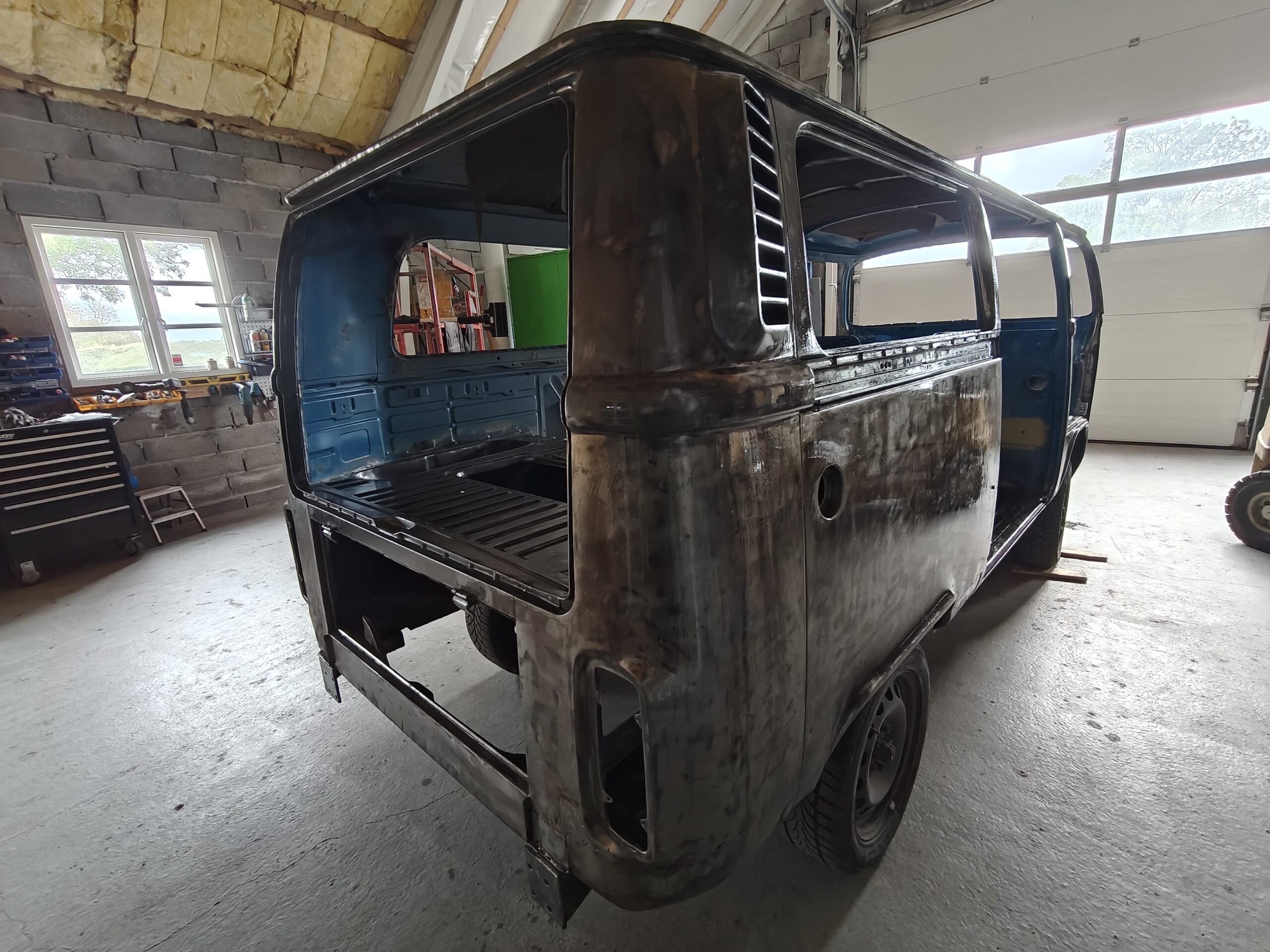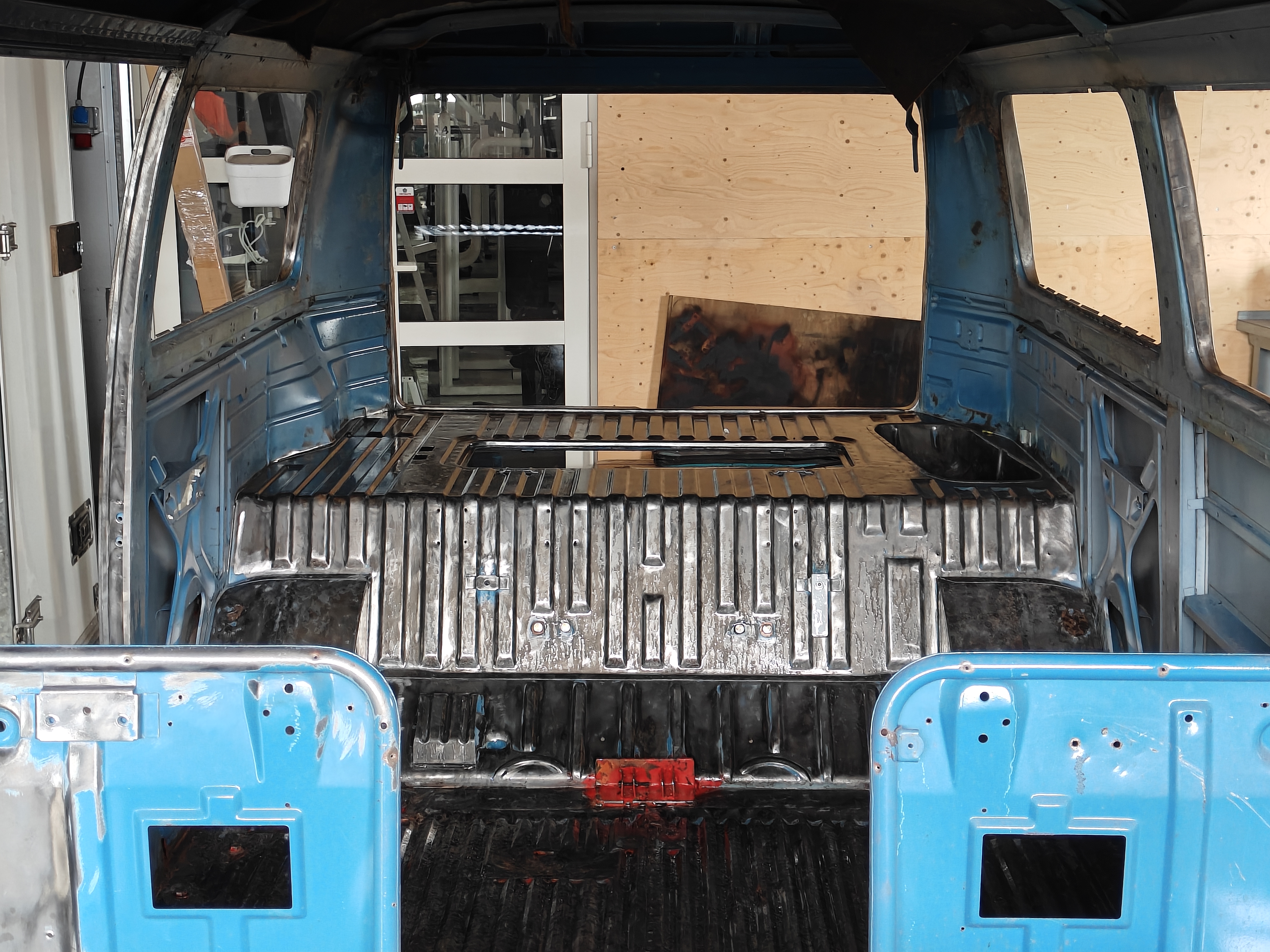 Resultatet er en VW T2, der igen står med et solidt fundament – fri for flyverust og med et motorrum, som nu er klar til renovering.