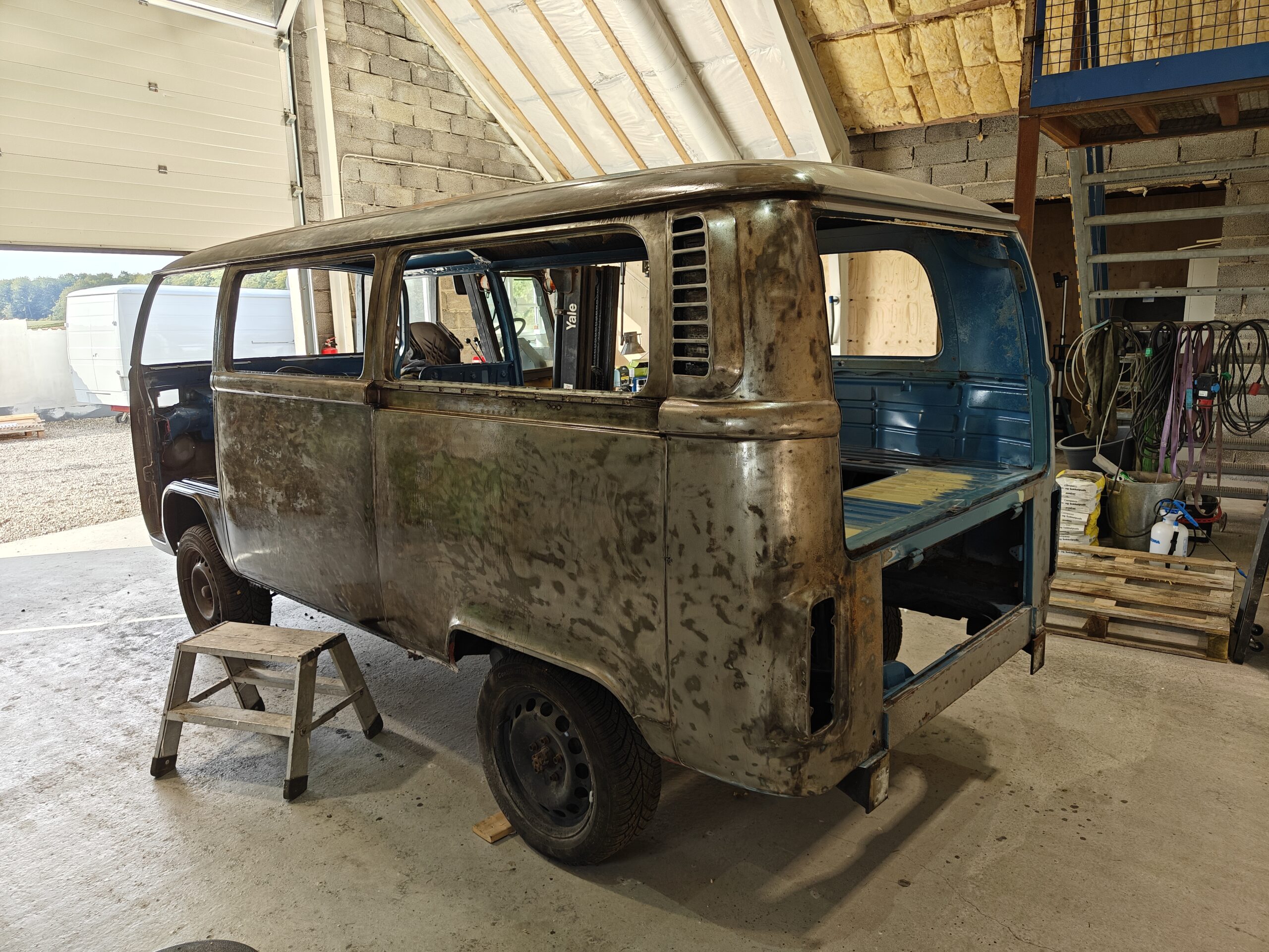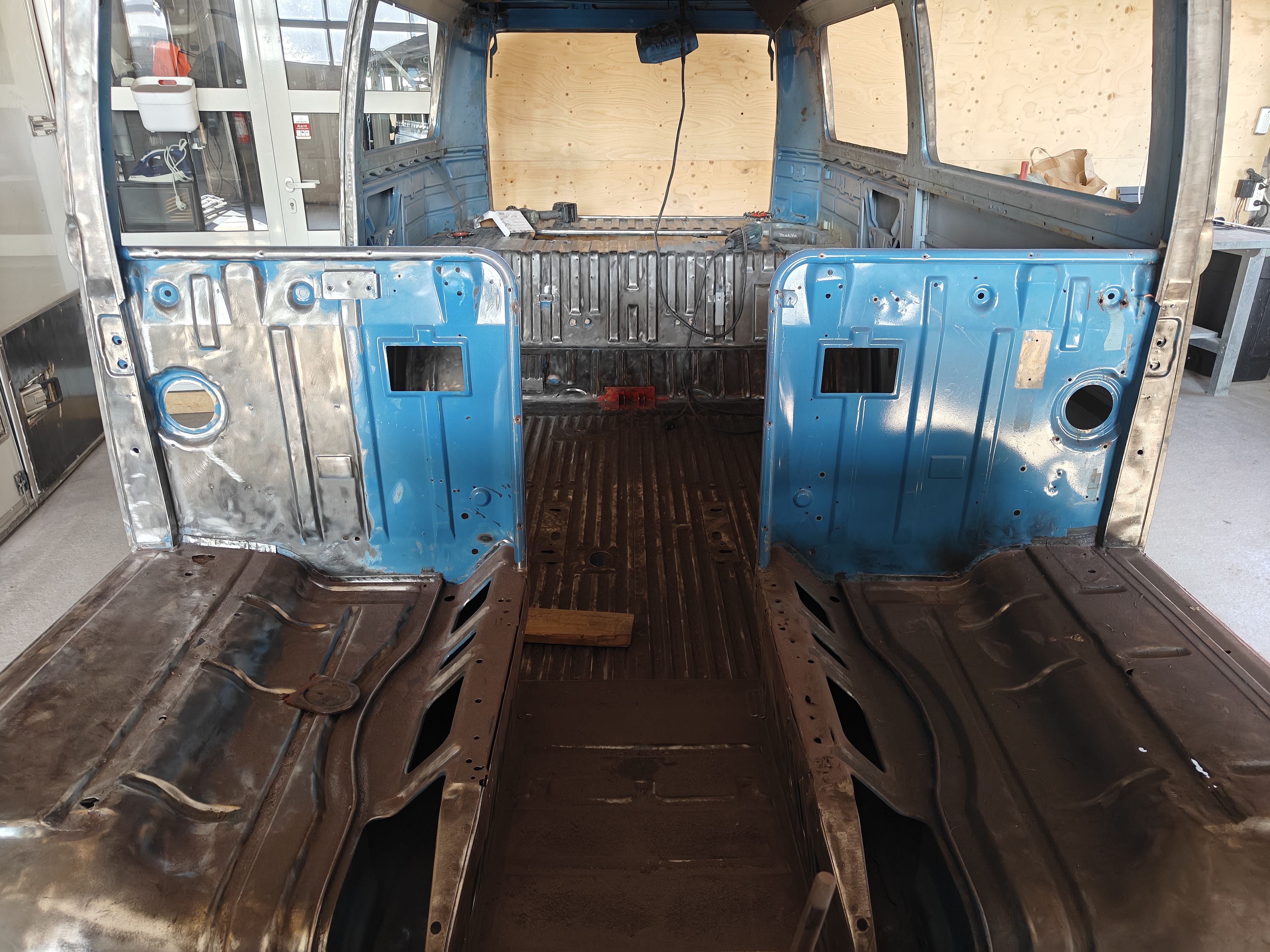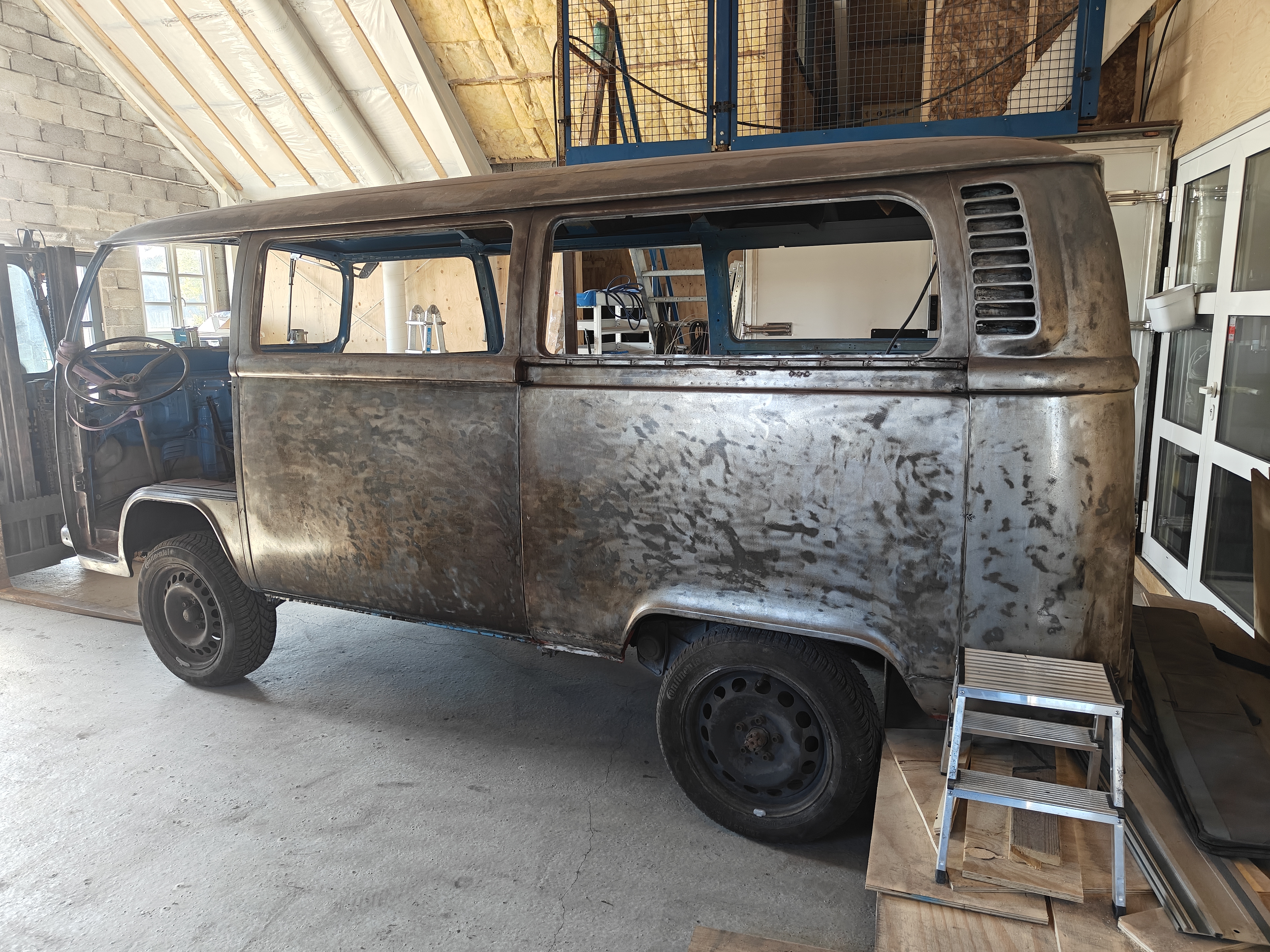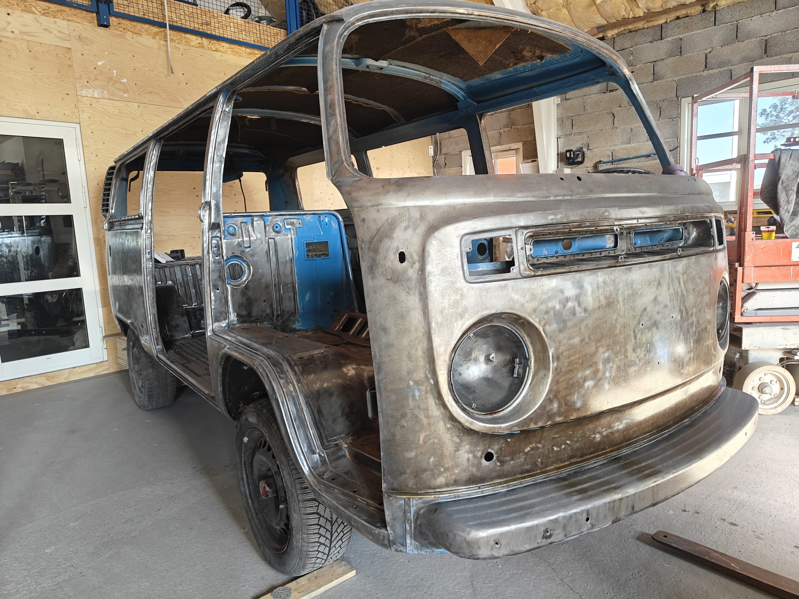 Resultatet er en VW T2, der igen står med et solidt fundament – fri for flyverust og med et motorrum, som nu er klar til renovering.