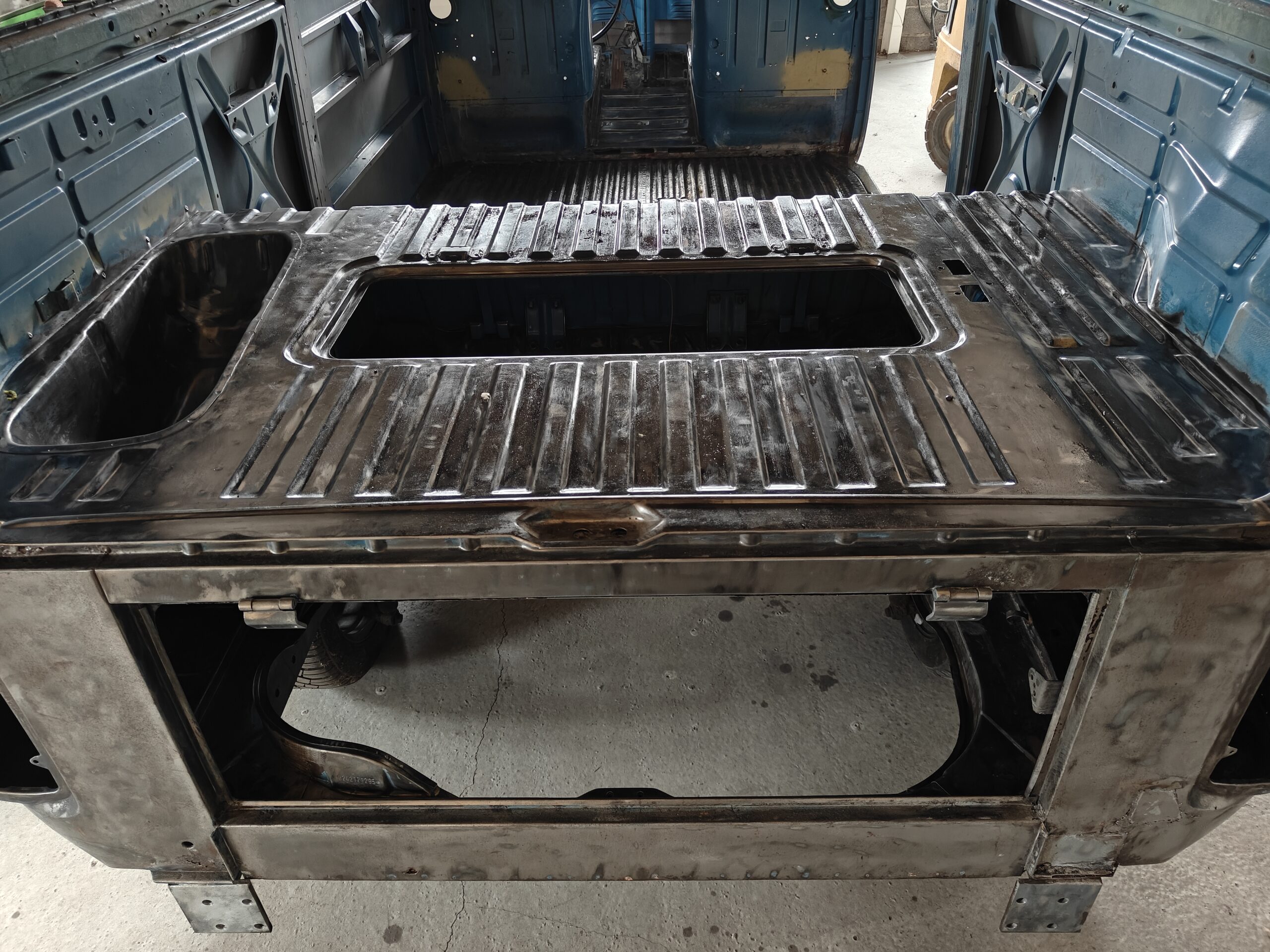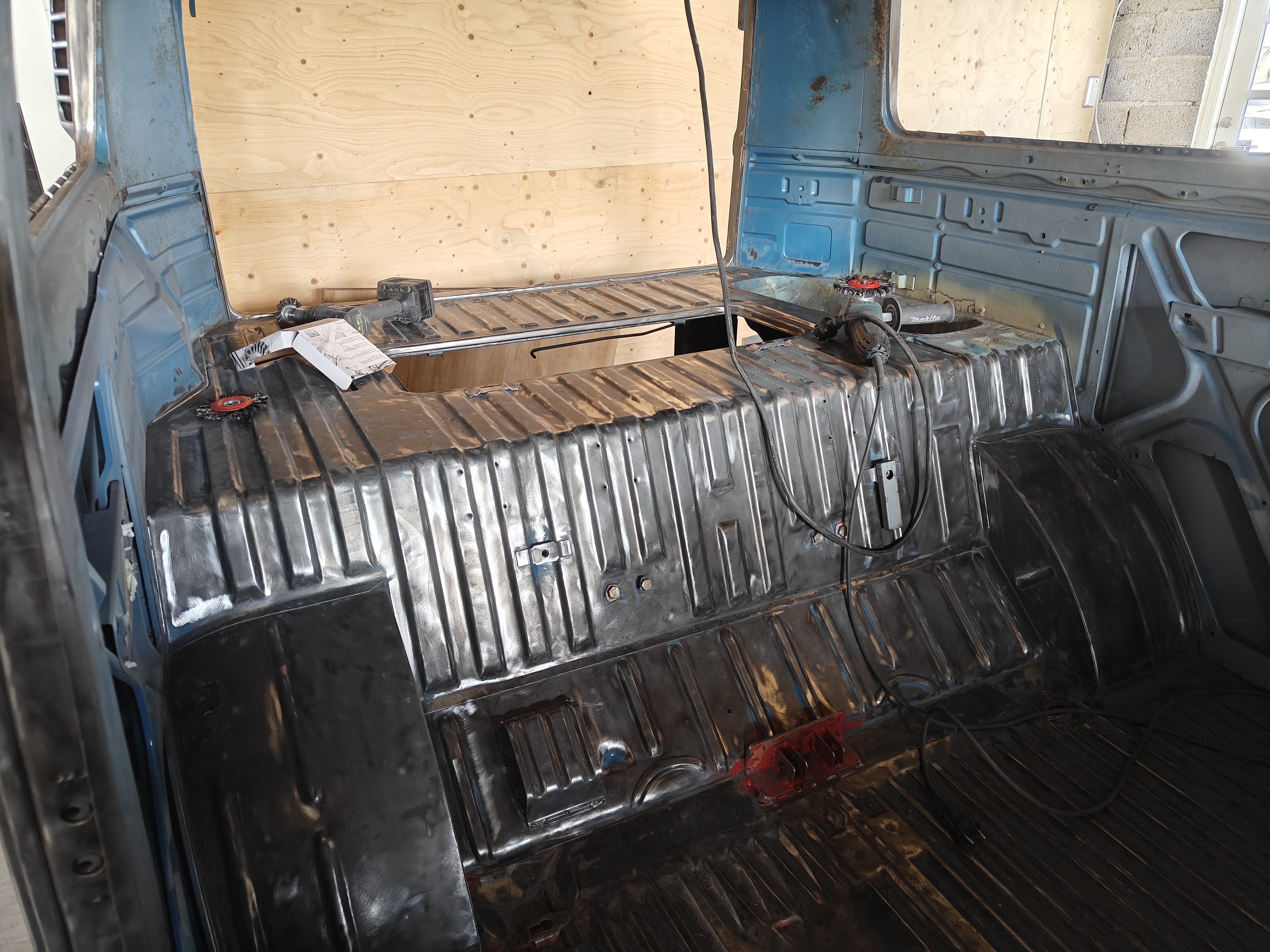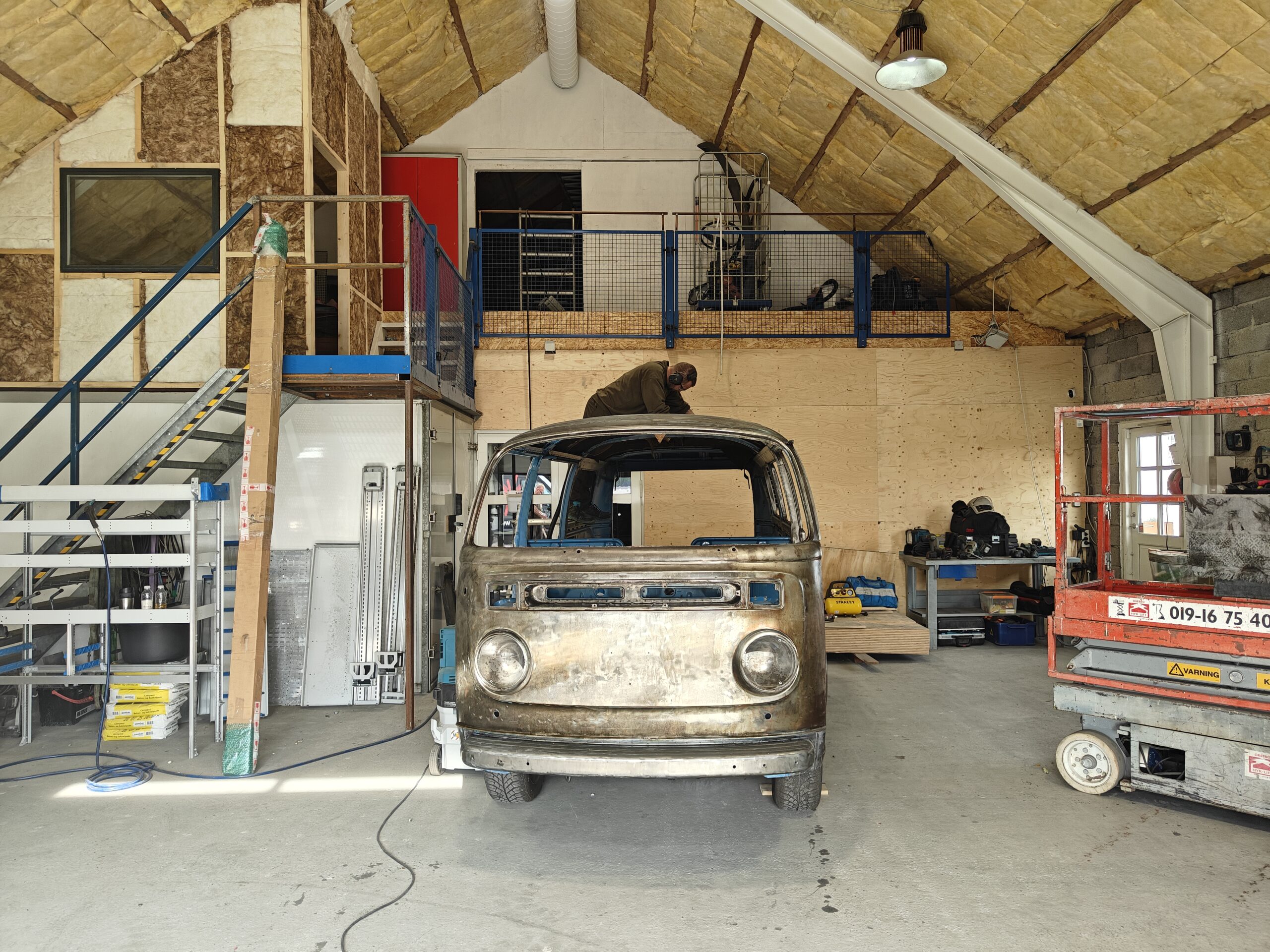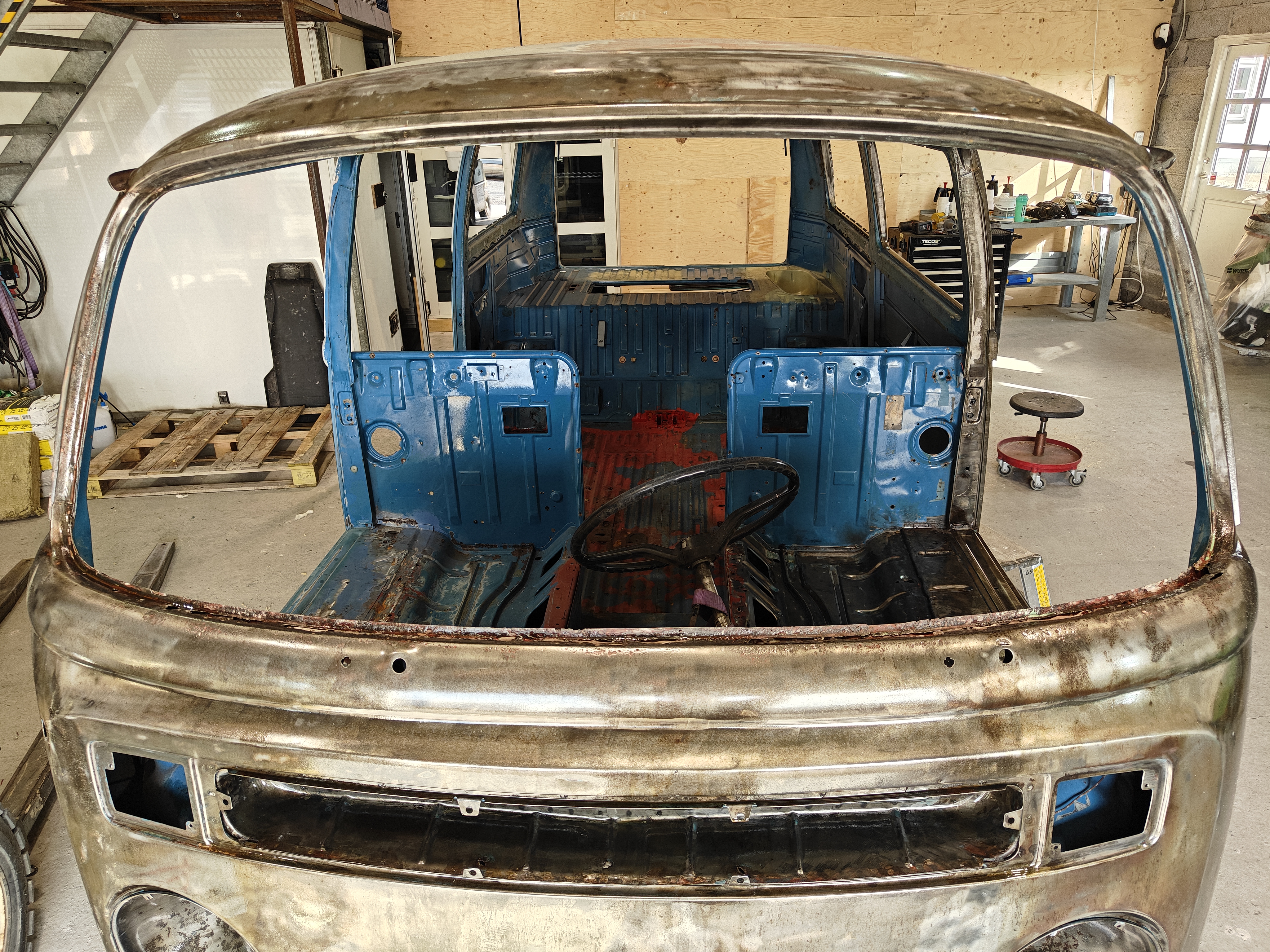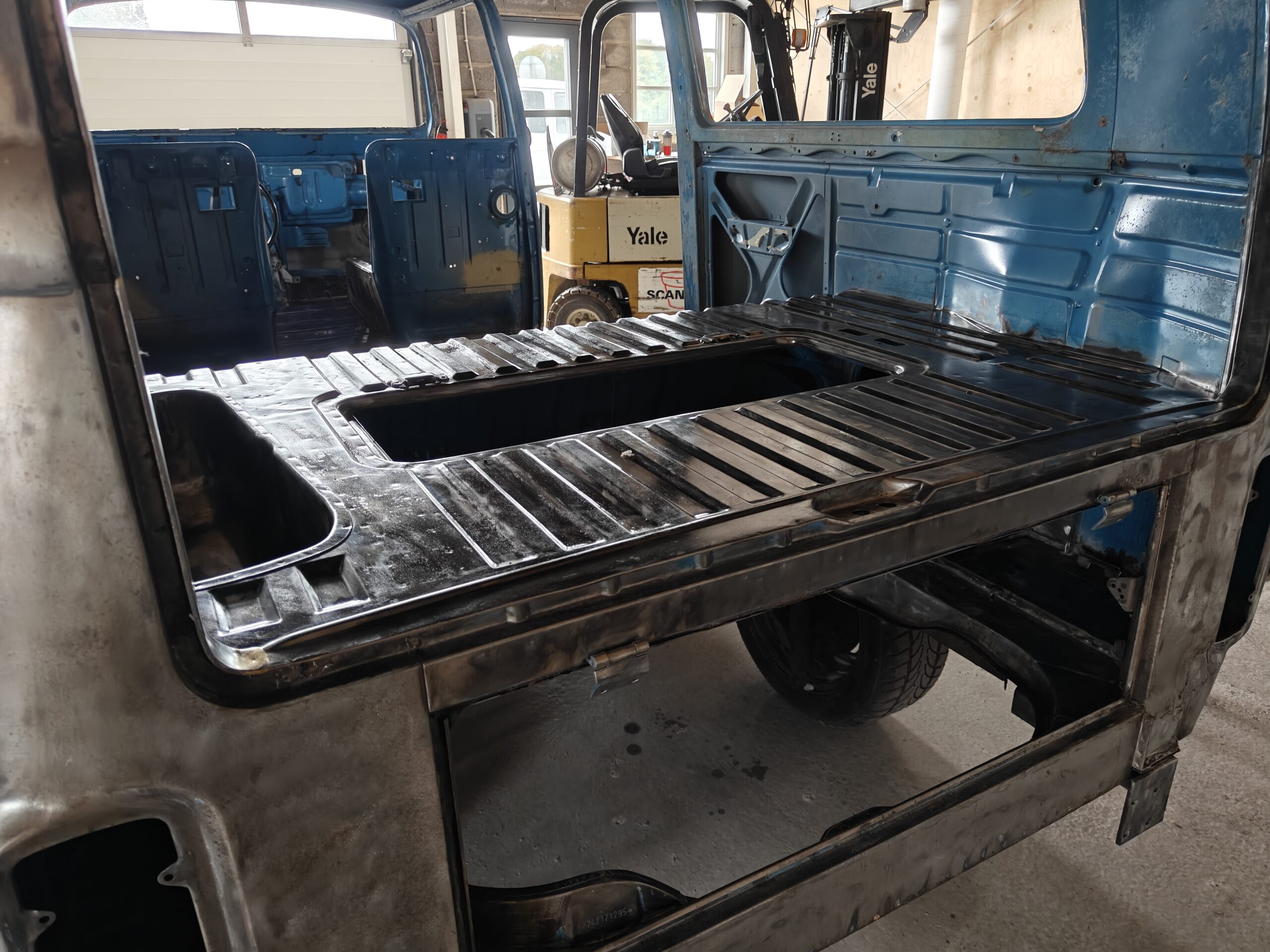 Resultatet er en VW T2, der igen står med et solidt fundament – fri for flyverust og med et motorrum, som nu er klar til renovering.