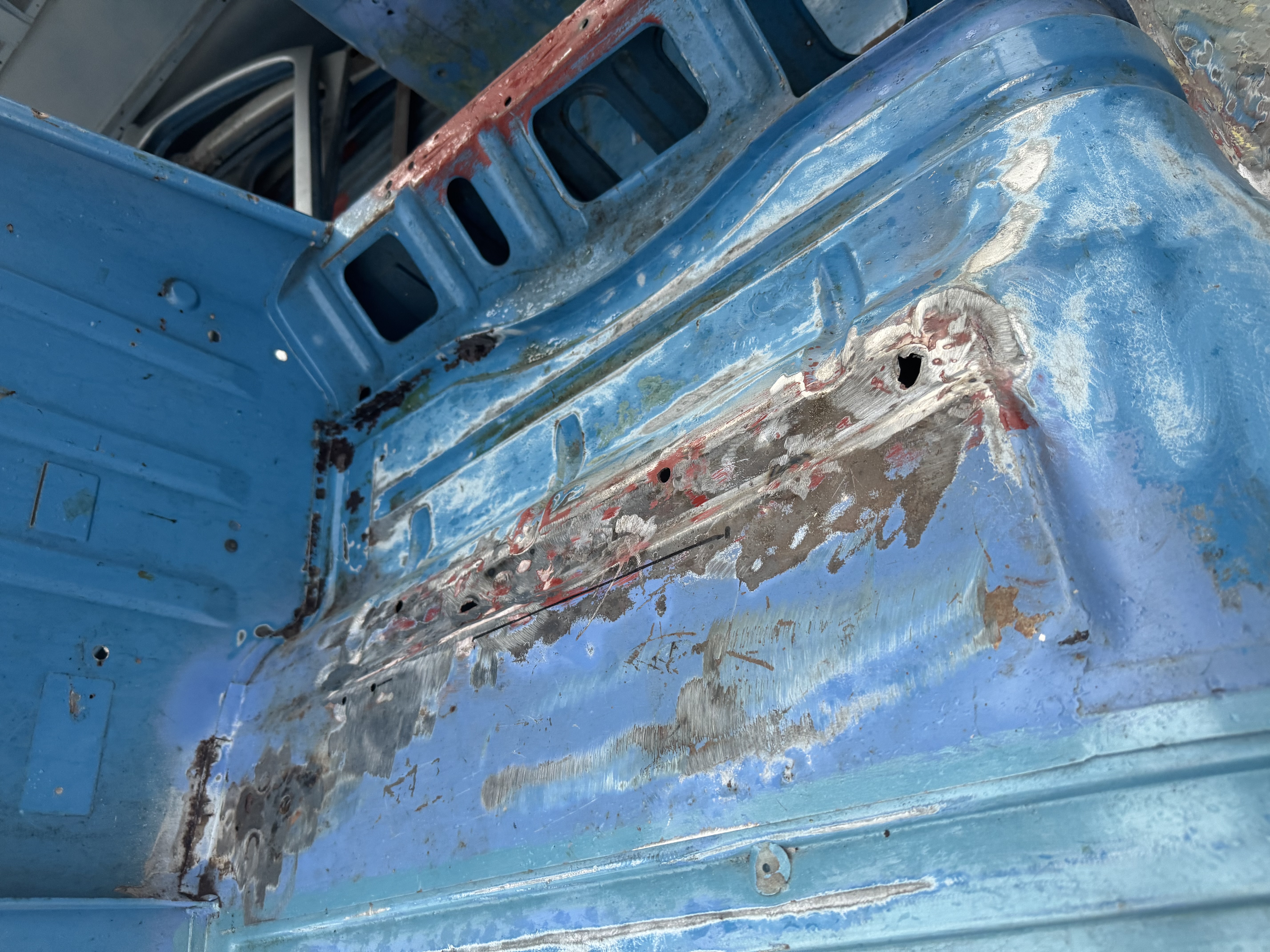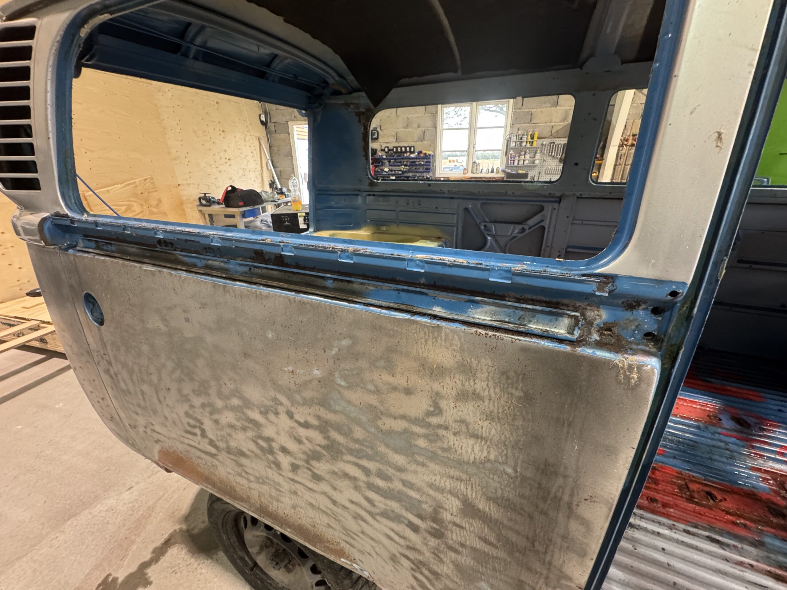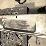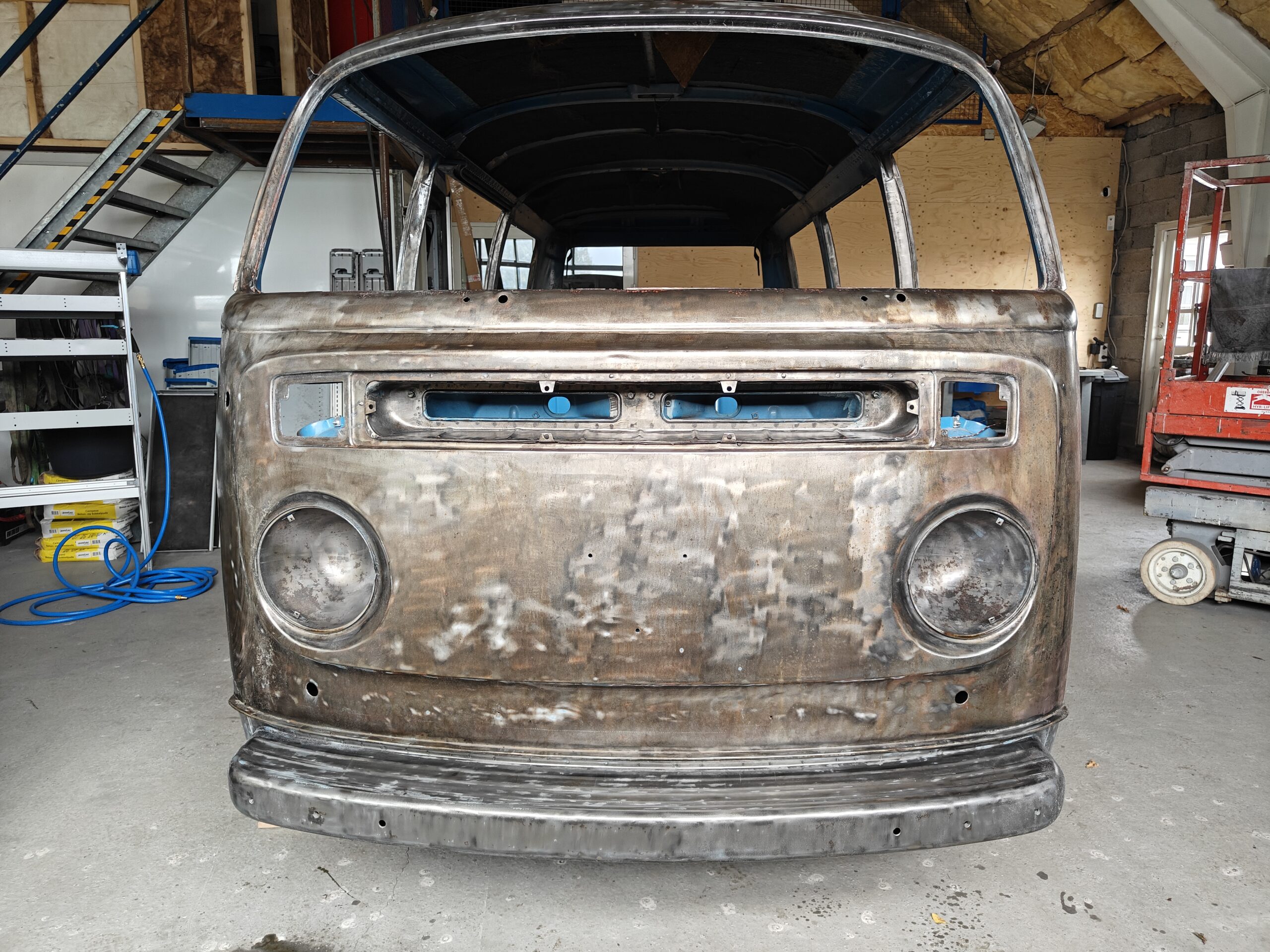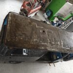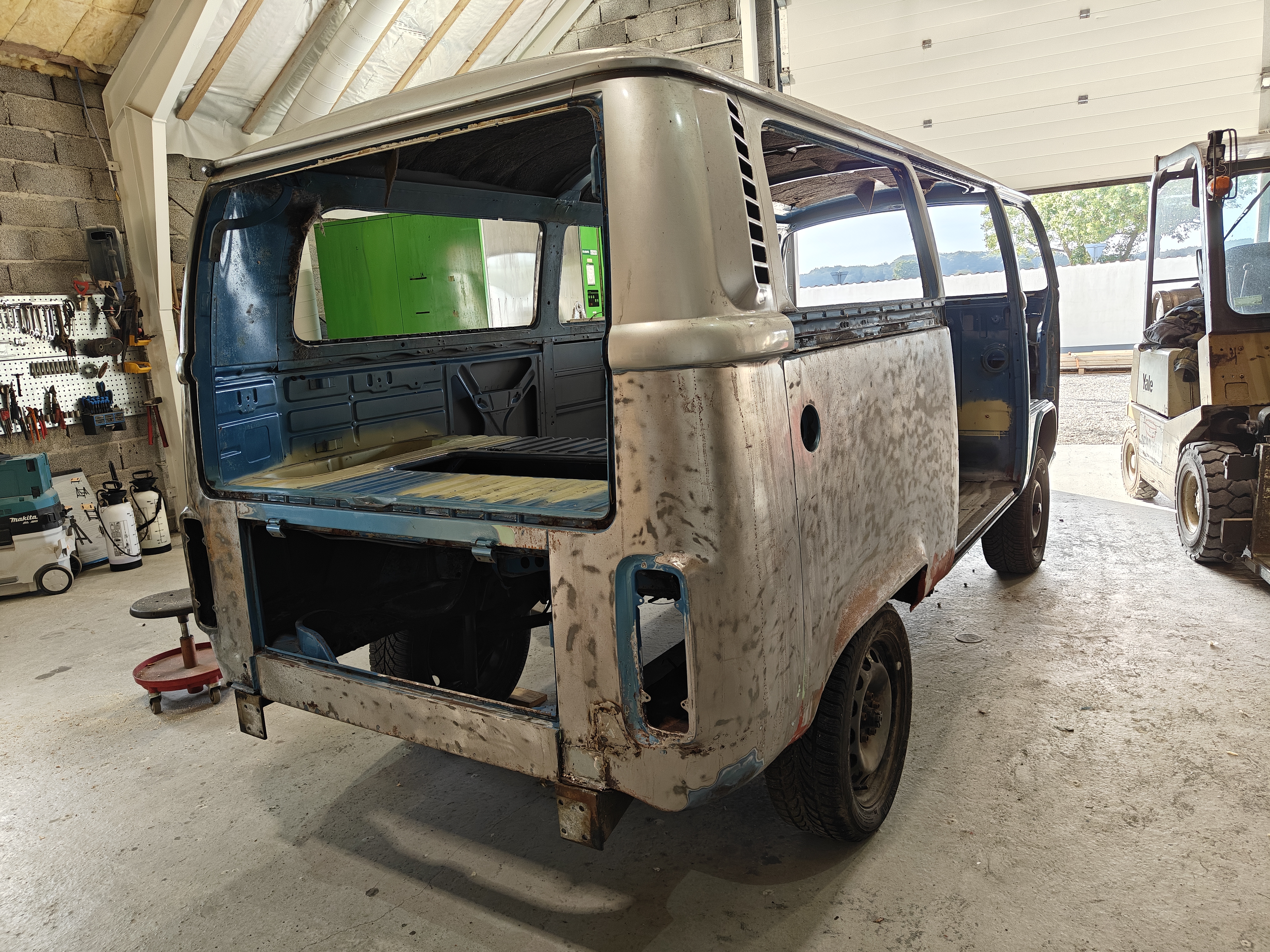 Ejeren af denne T2 ønskede vores hjælp til at skabe et stærkt grundlag for den videre restaurering. Vi startede med en lille prøveafrensning på stykket, der holder nummerpladen på bagsmækken.